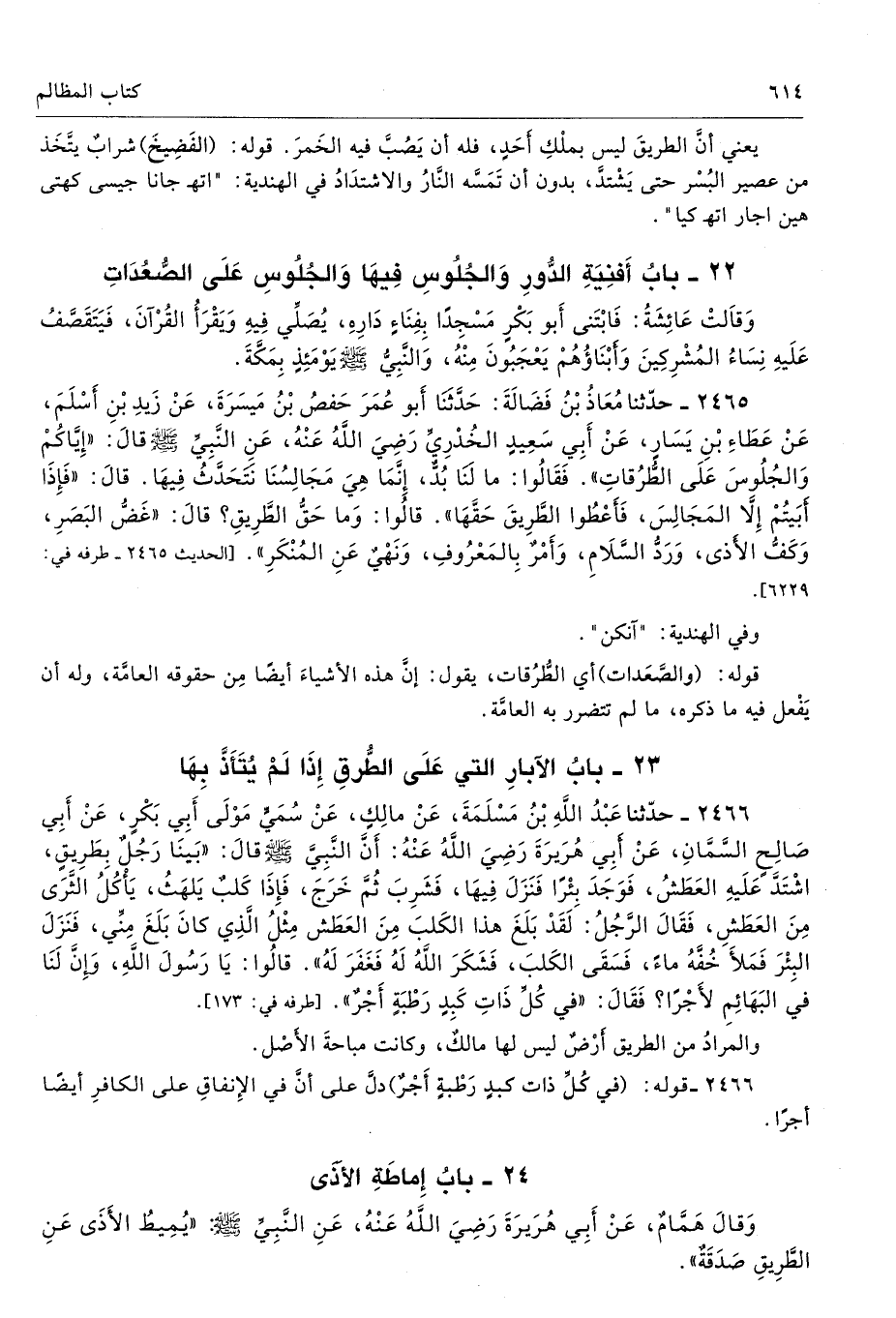 2465 - حَدَّثَنَا مُعَاذُ بْنُ فَضَالَةَ حَدَّثَنَا أَبُو عُمَرَ حَفْصُ بْنُ مَيْسَرَةَ عَنْ زَيْدِ بْنِ أَسْلَمَ عَنْ عَطَاءِ بْنِ يَسَارٍ عَنْ أَبِى سَعِيدٍ الْخُدْرِىِّ - رضى الله عنه - عَنِ النَّبِىِّ - صلى الله عليه وسلم - قَالَ «إِيَّاكُمْ وَالْجُلُوسَ عَلَى الطُّرُقَاتِ». فَقَالُوا مَا لَنَا بُدٌّ، إِنَّمَا هِىَ مَجَالِسُنَا نَتَحَدَّثُ فِيهَا. قَالَ «فَإِذَا أَبَيْتُمْ إِلاَّ الْمَجَالِسَ فَأَعْطُوا الطَّرِيقَ حَقَّهَا» قَالُوا وَمَا حَقُّ الطَّرِيقِ؟ قَالَ «غَضُّ الْبَصَرِ، وَكَفُّ الأَذَى، وَرَدُّ السَّلاَمِ، وَأَمْرٌ بِالْمَعْرُوفِ، وَنَهْىٌ عَنِ الْمُنْكَرِ». طرفه 6229 - تحفة 4164