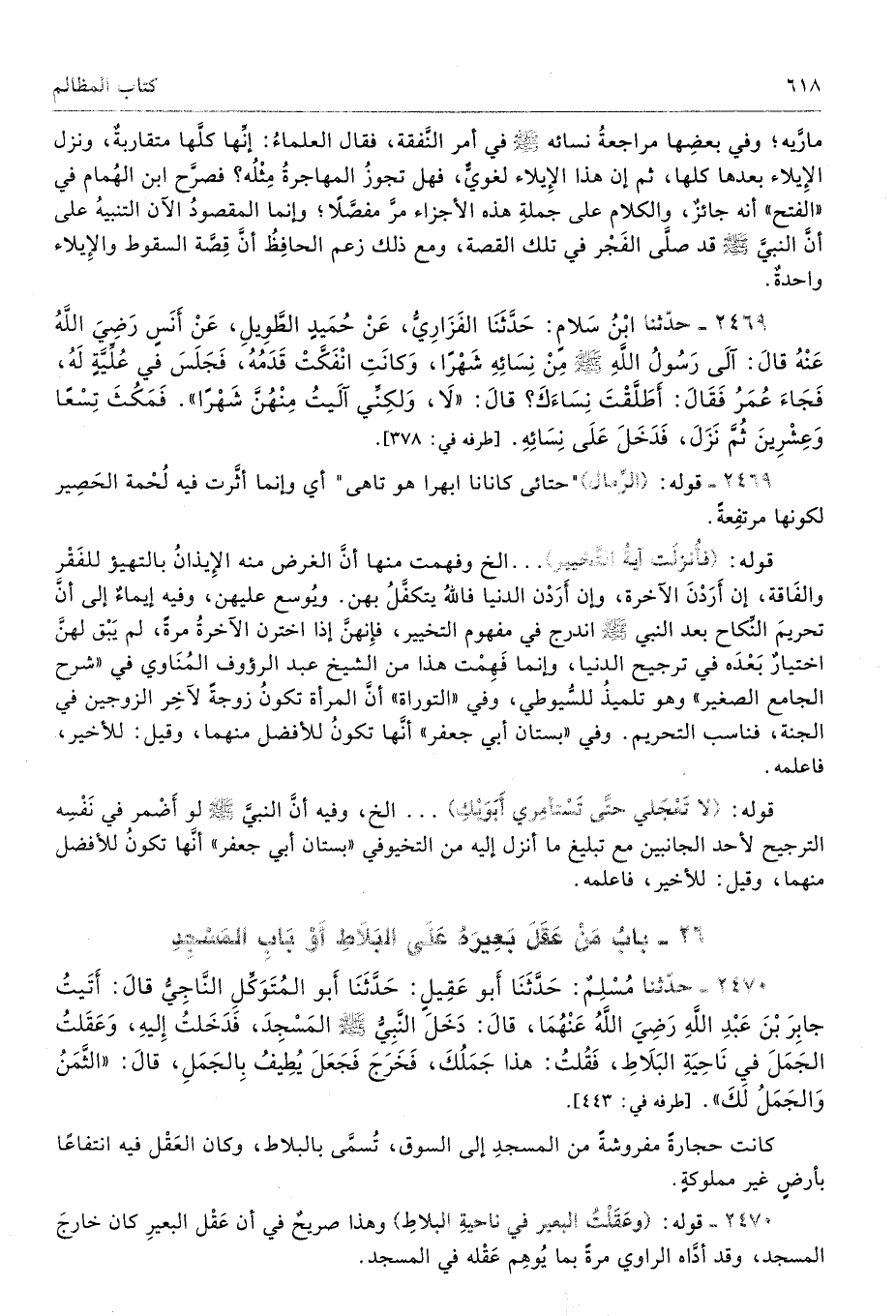 2469 - حَدَّثَنَا ابْنُ سَلاَمٍ حَدَّثَنَا الْفَزَارِىُّ عَنْ حُمَيْدٍ الطَّوِيلِ عَنْ أَنَسٍ - رضى الله عنه - قَالَ آلَى رَسُولُ اللَّهِ - صلى الله عليه وسلم - مِنْ نِسَائِهِ شَهْرًا، وَكَانَتِ انْفَكَّتْ قَدَمُهُ فَجَلَسَ فِى عِلِّيَّةٍ لَهُ، فَجَاءَ عُمَرُ، فَقَالَ أَطَلَّقْتَ نِسَاءَكَ قَالَ «لاَ، وَلَكِنِّى آلَيْتُ مِنْهُنَّ شَهْرًا». فَمَكُثَ تِسْعًا وَعِشْرِينَ، ثُمَّ نَزَلَ، فَدَخَلَ عَلَى نِسَائِهِ. أطرافه 378، 689، 732، 733، 805، 1114، 1911، 5201، 5289، 6684 تحفة 767