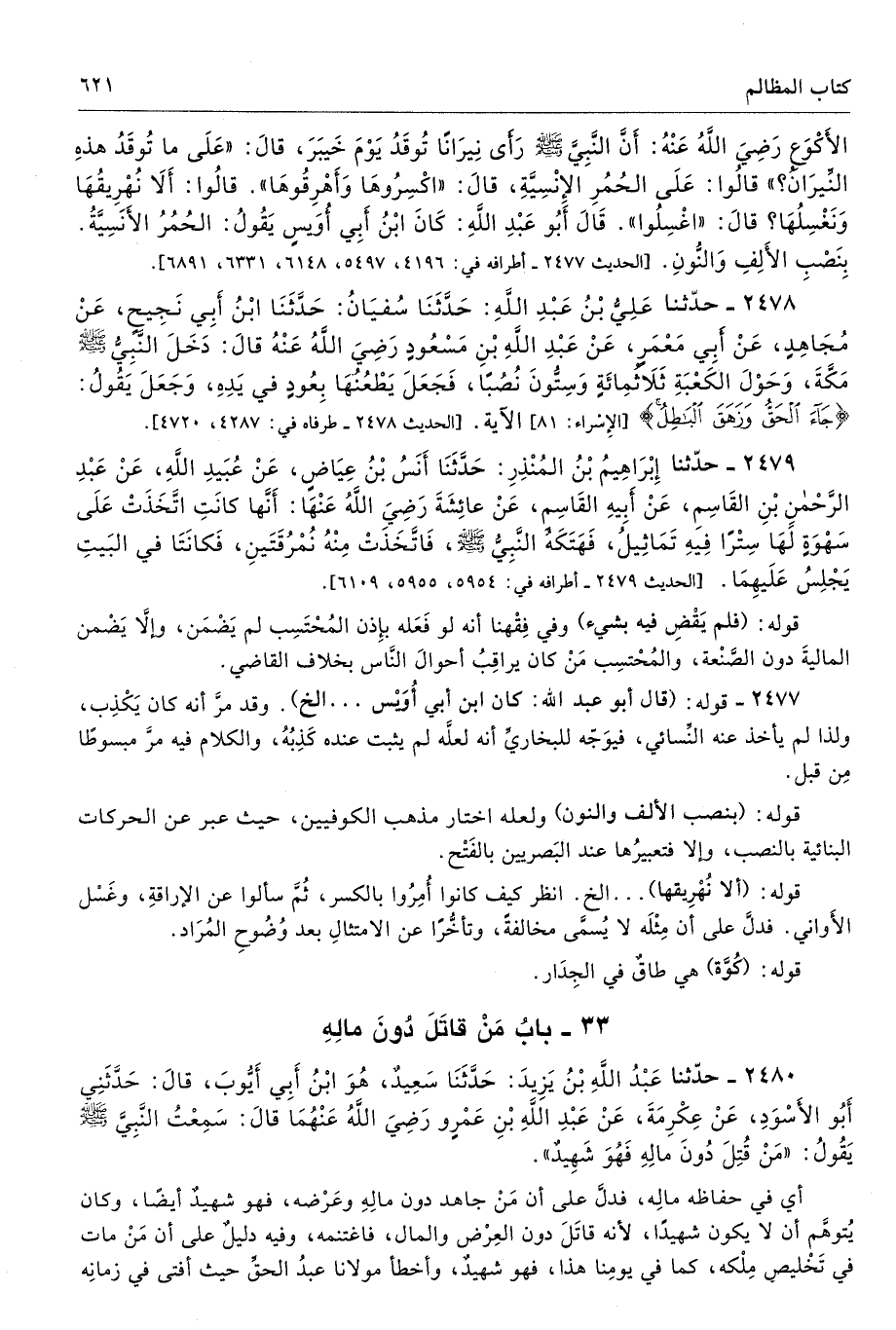 2480 - حَدَّثَنَا عَبْدُ اللَّهِ بْنُ يَزِيدَ حَدَّثَنَا سَعِيدٌ - هُوَ ابْنُ أَبِى أَيُّوبَ - قَالَ حَدَّثَنِى أَبُو الأَسْوَدِ عَنْ عِكْرِمَةَ عَنْ عَبْدِ اللَّهِ بْنِ عَمْرٍو - رضى الله عنهما - قَالَ سَمِعْتُ النَّبِىَّ - صلى الله عليه وسلم - يَقُولُ «مَنْ قُتِلَ دُونَ مَالِهِ فَهُوَ شَهِيدٌ». تحفة 8891