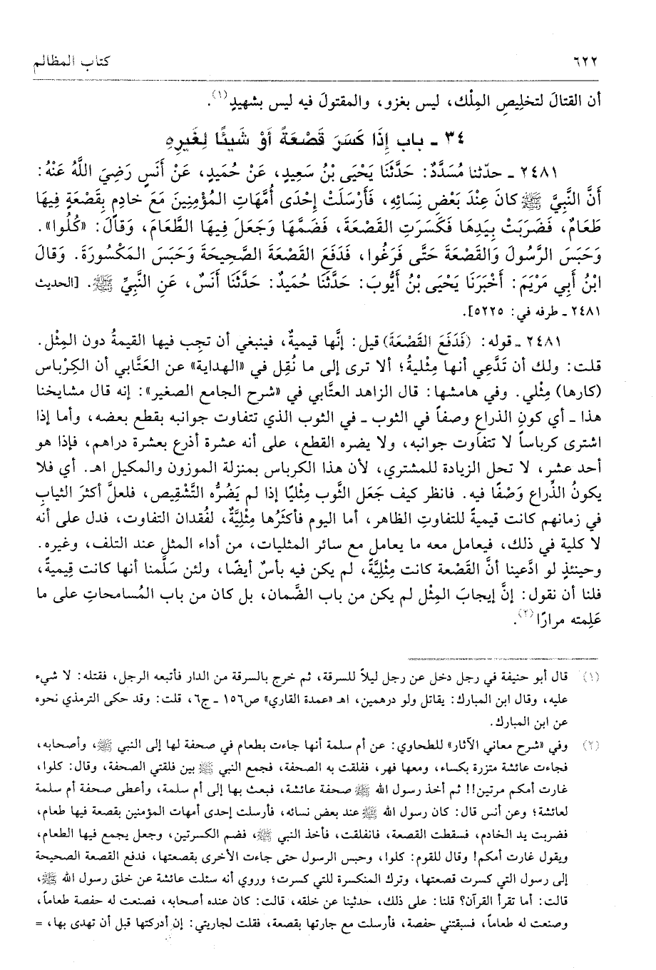 2481 - قوله: (فَدَفَعَ القَصْعَةَ) قيل: إنَّها قيميةٌ، فينبغي أن تجِب فيها القيمةُ دون المِثْل. قلت: ولك أن تَدَّعِي أنها مِثْليةُ؛ ألا ترى إلى ما نُقِل في «الهداية» عن العَتَّابي أن الكِرْباس (كارها) مِثْلي. وفي هامشها: قال الزاهد العتَّابي في «شرح الجامع الصغير»: إنه قال مشايخنا هذا - أي كونِ الذراعِ وَأن تجِب فيها القيمةُ دون المِثْل. قلت: ولك أن تَدَّعِي أنها مِثْليةُ؛ ألا ترى إلى ما نُقِل في «الهداية» عن العَتَّابي أن الكِرْباس (كارها) مِثْلي. وفي هامشها: قال الزاهد العتَّابي في «شرح الجامع الصغير»: إنه قال مشايخنا هذا - أي كونِ الذراعِ وَكِيل. اهـ. أي فلا يكونُ الذِّراع وَصْفًا فيه. فانظر كيف جَعَل الثَّوب مِثْليًا إذا لم يَضُرُّه التَّشْقِيص، فلعلَّ أكثرَ الثيابِ في زمانهم كانت قيمةً للتفاوتِ الظاهر، أما اليوم فأكثَرُها مِثْلِيَّةٌ، لفُقدان التفاوت، وغيره. وحينئذٍ لو ادَّعينا أنَّ القَصْعة كانت مِثْلِيَّةً، لم يكن فيه بأسٌ أيضًا، ولئن سَلَّمنا أنها كانت قِيمةً، فلنا أن نقول: إنَّ إيجابَ المِثْل لم يكن من باب الضَّمان، بل كان من باب المُسامحاتِ على ما عَلِمته مرارًا (¬2).