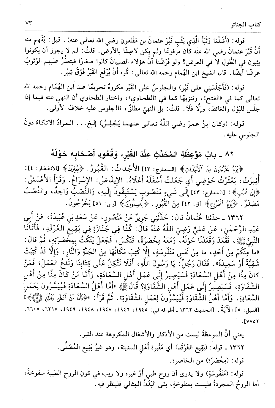 قوله: (فَأَجْلَسَنِي على قَبْر) والجلوسُ على القَبْر مكروهٌ تحريمًا عند ابن الهُمَام رحمه الله تعالى كما في «الفتح»، وتنزيهًا كما في «الطحاوي»، واختار الطحاوي أن النهيَّ عنه فيما إذا جلَس للبَوْل والغائط، وإلا فلا. قلتُ: بل النهيُ مطلقٌ، فالجلوس عليه خلافُ الأَوْلى.