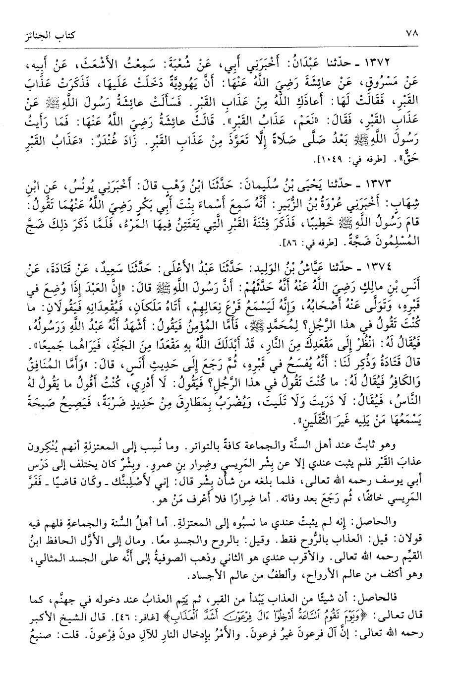 1372 - حَدَّثَنَا عَبْدَانُ أَخْبَرَنِى أَبِى عَنْ شُعْبَةَ سَمِعْتُ الأَشْعَثَ عَنْ أَبِيهِ عَنْ مَسْرُوقٍ عَنْ عَائِشَةَ - رضى الله عنها - أَنَّ يَهُودِيَّةً دَخَلَتْ عَلَيْهَا، فَذَكَرَتْ عَذَابَ الْقَبْرِ، فَقَالَتْ لَهَا أَعَاذَكِ اللَّهُ مِنْ عَذَابِ الْقَبْرِ. فَسَأَلَتْ عَائِشَةُ رَسُولَ اللَّهِ - صلى الله عليه وسلم - عَنْ عَذَابِ الْقَبْرِ فَقَالَ «نَعَمْ عَذَابُ الْقَبْرِ». قَالَتْ عَائِشَةُ - رضى الله عنها - فَمَا رَأَيْتُ رَسُولَ اللَّهِ - صلى الله عليه وسلم - بَعْدُ صَلَّى صَلاَةً إِلاَّ تَعَوَّذَ مِنْ عَذَابِ الْقَبْرِ. زَادَ غُنْدَرٌ «عَذَابُ الْقَبْرِ حَقٌّ». أطرافه 1049، 1055، 6366 - تحفة 17660
