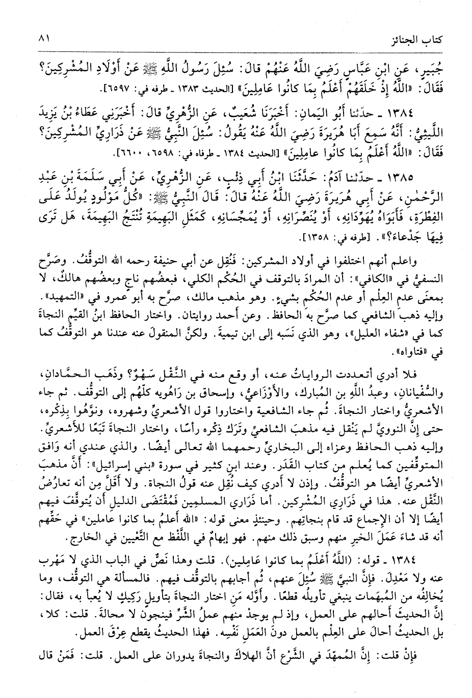 واعلم أنهم اختلفوا في أولاد المشركين: فَنُقِل عن أبي حنيفة رحمه الله التوقَّفُ. وصَرَّح النسفيُّ في «الكافي»: أن المرادَ بالتوقف في الحُكْم الكلي، فبعضُهم ناجٍ وبعضُهم هالكٌ، لا بمعنَى عدمِ العِلْم أو عدم الحُكْمِ بشيءٍ. وهو مذهب مالك، صرَّح به أبو عمرو في «التمهيد». وإليه ذهب الشافعي كما صرَّح به الحافظ. وعن أَحمد روايتان. واختار الحافظ ابنُ القيِّم النجاةَ كما في «شفاء العليل»، وهو الذي نَسَبه إلى ابن تيميةَ. ولكنَّ المنقولَ عنه عندنا هو التوقُّفْ كما في «فتاواه».