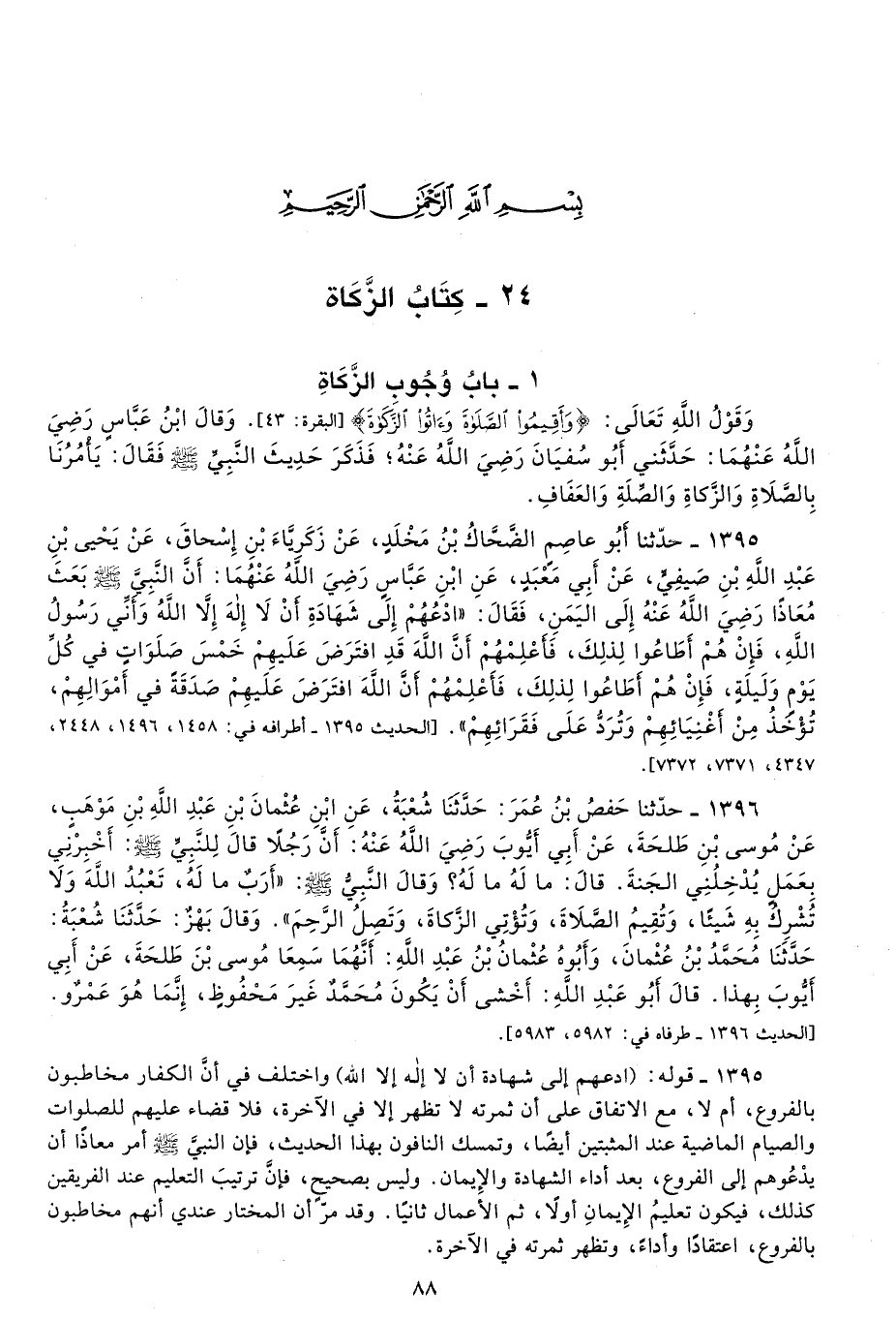1395 - حَدَّثَنَا أَبُو عَاصِمٍ الضَّحَّاكُ بْنُ مَخْلَدٍ عَنْ زَكَرِيَّاءَ بْنِ إِسْحَاقَ عَنْ يَحْيَى بْنِ عَبْدِ اللَّهِ بْنِ صَيْفِىٍّ عَنْ أَبِى مَعْبَدٍ عَنِ ابْنِ عَبَّاسٍ - رضى الله عنهما - أَنَّ النَّبِىَّ - صلى الله عليه وسلم - بَعَثَ مُعَاذًا - رضى الله عنه - إِلَى الْيَمَنِ فَقَالَ «ادْعُهُمْ إِلَى شَهَادَةِ أَنْ لاَ إِلَهَ إِلاَّ اللَّهُ، وَأَنِّى رَسُولُ اللَّهِ، فَإِنْ هُمْ أَطَاعُوا لِذَلِكَ فَأَعْلِمْهُمْ أَنَّ اللَّهَ قَدِ افْتَرَضَ عَلَيْهِمْ خَمْسَ صَلَوَاتٍ فِى كُلِّ يَوْمٍ وَلَيْلَةٍ، فَإِنْ هُمْ أَطَاعُوا لِذَلِكَ فَأَعْلِمْهُمْ أَنَّ اللَّهَ افْتَرَضَ عَلَيْهِمْ صَدَقَةً فِى أَمْوَالِهِمْ، تُؤْخَذُ مِنْ أَغْنِيَائِهِمْ وَتُرَدُّ عَلَى فُقَرَائِهِمْ». أطرافه 1458، 1496، 2448، 4347، 7371، 7372 - تحفة 6511 - 130/ 2