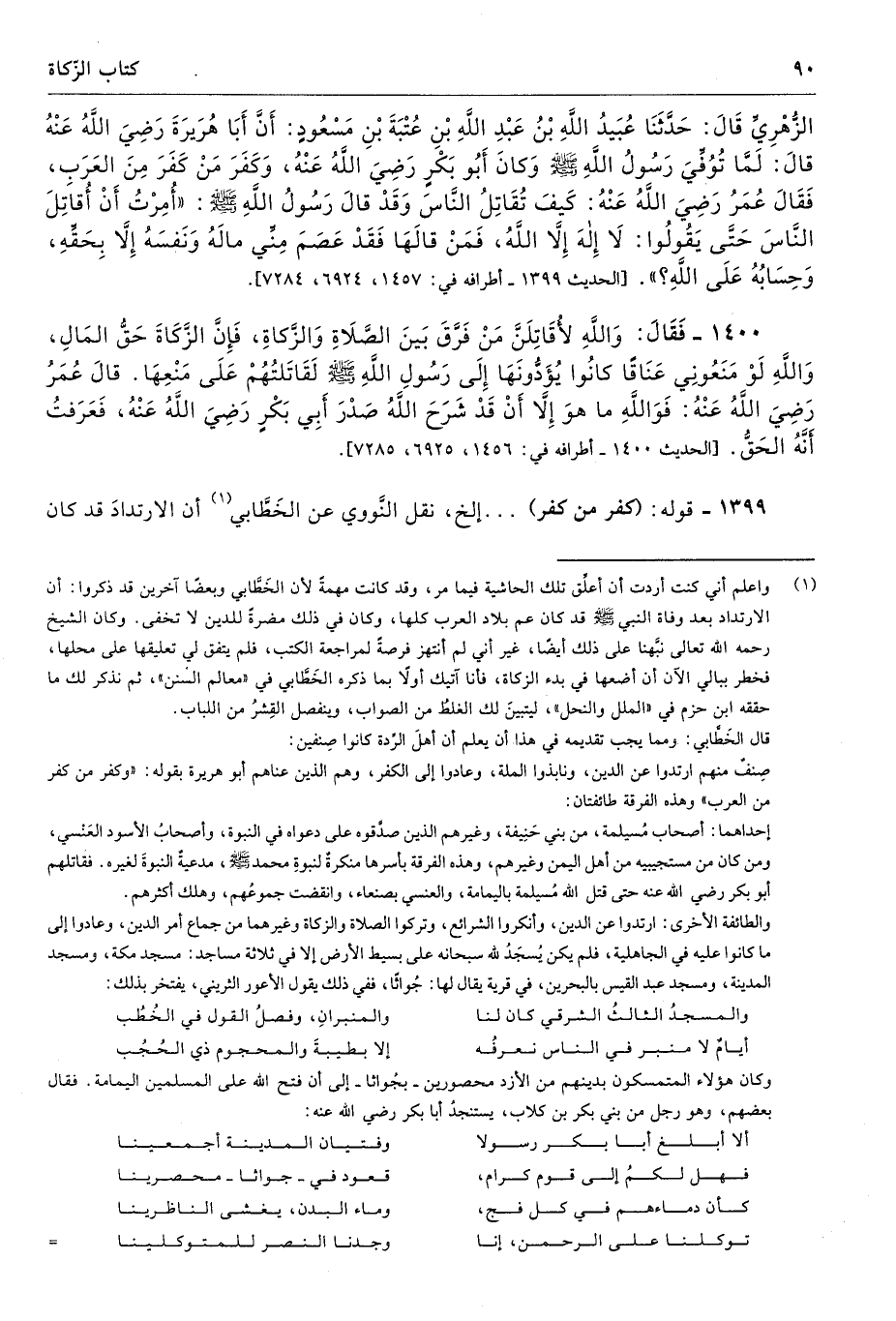 (¬1) واعلم أني كنت أردت أن أعلِّق تلك الحاشية فيما مر، وقد كانت مهمةً لأن الخَطَّابي وبعضًا آخرين قد ذكروا: أن الارتداد بعد وفاة النبي - صلى الله عليه وسلم - قد كان عم بلاد العرب كلها، وكان في ذلك مضرةً للدين لا تخفى. وكان الشيخ رحمه الله تعالى نبَّهنا على ذلك أيضًا، غير أني لم أنتهز فرصةً لمراجعة الكتب، فلم يتفق لي تعليقها على محلها، فخطر ببالي الآن أن أضعها في بدء الزكاة، فأنا آتيك أولًا بما ذكره الخَطَّابي في "معالم السنن"، ثم نذكر لك ما حققه ابن حزم في "الملل والنحل"، ليتبينَ لك الغلطُ من الصواب، وينفصل القِشرُ من اللباب.
