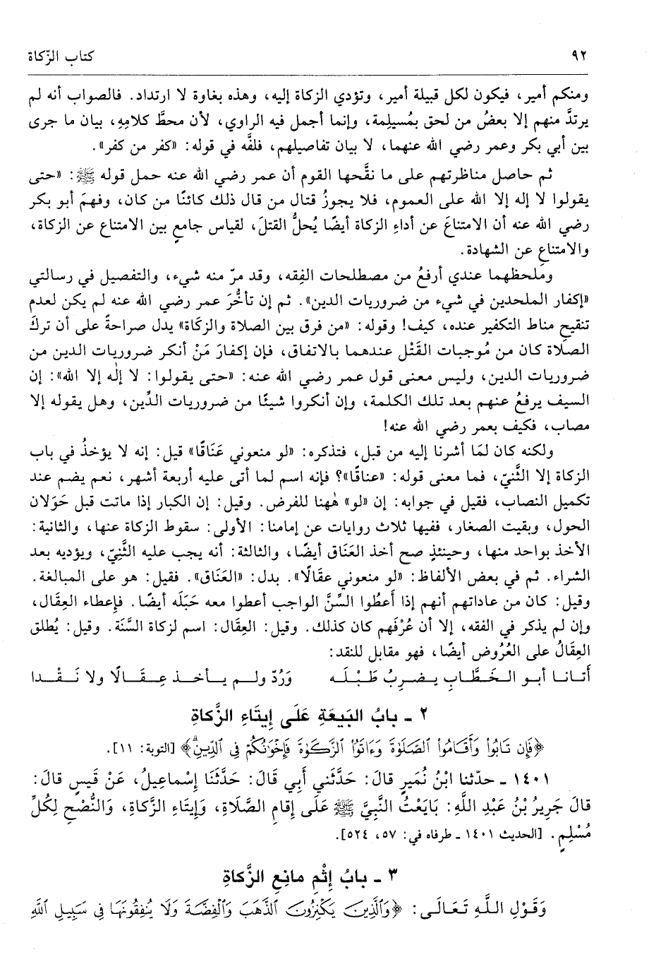 وملحظهما عندي أرفعُ من مصطلحات الفِقه، وقد مرّ منه شيء، والتفصيل في رسالتي «إكفار الملحدين في شيء من ضروريات الدين». ثم إن تأخُّرَ عمر رضي الله عنه لم يكن لعدم تنقيحِ مناط التكفير عنده، كيف وقوله: «من فرق بين الصلاة والزكَاة» يدل صراحةً على أن تركَ الصلاة كان من مُوجبات القَتْل عندهما بالاتفاق، فإن إكفارَ مَنْ أنكر ضروريات الدين من ضروريات الدين، وليس معنى قول عمر رضي الله عنه: «حتى يقولوا: لا إله إلا الله»: إن السيف يرفعُ عنهم بعد تلك الكلمة، وإن أنكروا شيئًا من ضروريات الدِّين، وهل يقوله إلا مصاب، فكيف بعمر رضي الله عنه!