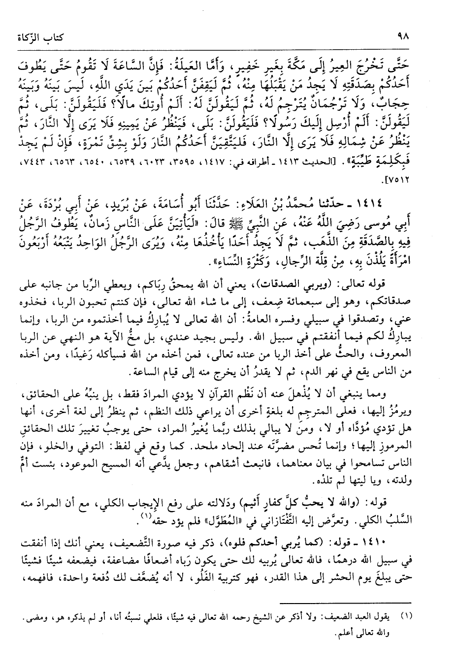 1410 - قوله: (كما يُربي أحدكم فلوه)، ذكر فيه صورة التَّضعيف، يعني أنك إذا أنفقت في سبيل الله درهمًا، فالله تعالى يُربِّيْه لك حتى يكون رَبَّاه أضغافًا مضاعفة، فيضعفه شيئًا فشيئًا حتى يبلغَ يوم الحشر إلى هذا القدر، فهو كتربية الفَلُو، لا أنه يُضعَّف لك دُفعة واحدة، فافهمه،