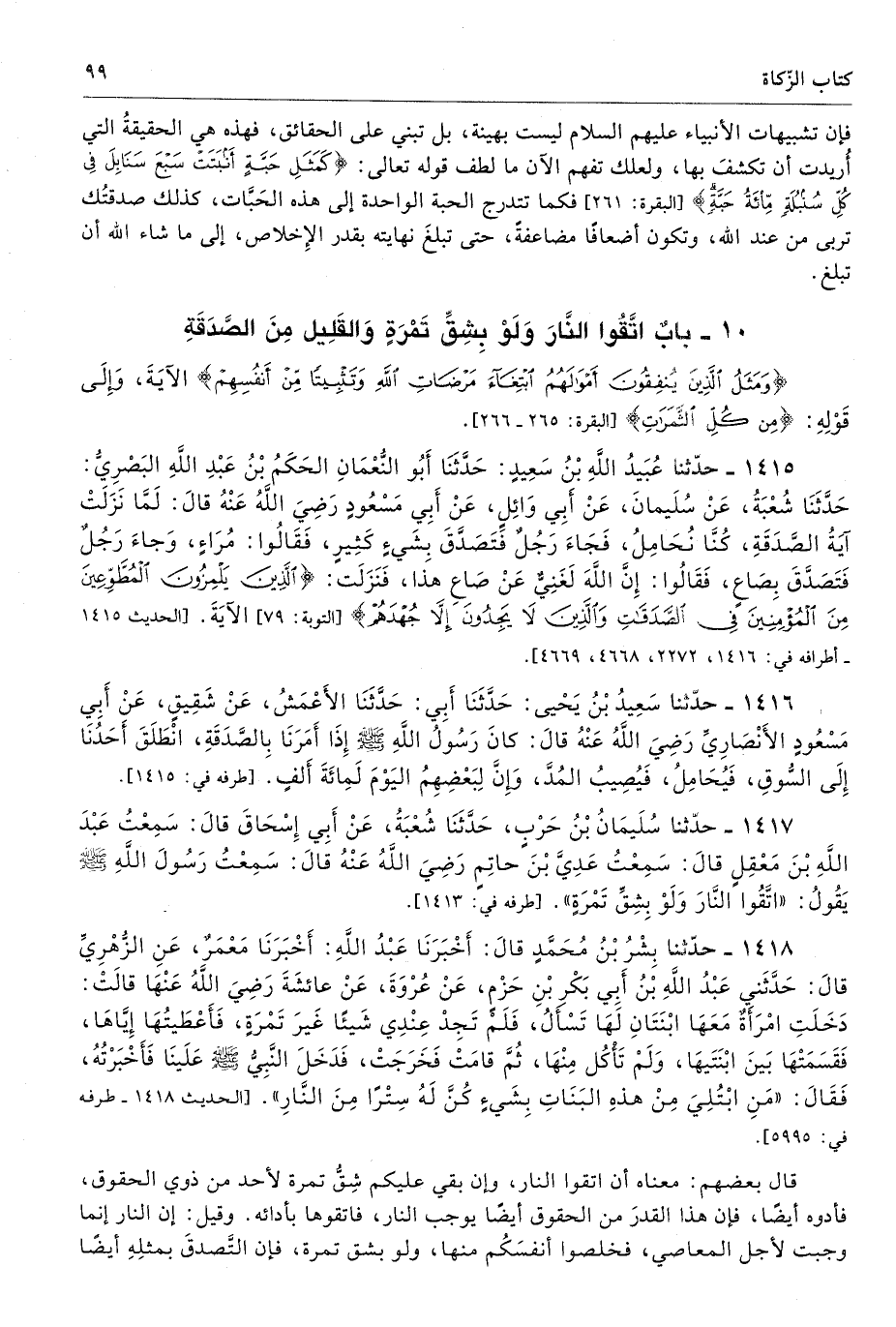 1417 - حَدَّثَنَا سُلَيْمَانُ بْنُ حَرْبٍ حَدَّثَنَا شُعْبَةُ عَنْ أَبِى إِسْحَاقَ قَالَ سَمِعْتُ عَبْدَ اللَّهِ بْنَ مَعْقِلٍ قَالَ سَمِعْتُ عَدِىَّ بْنَ حَاتِمٍ - رضى الله عنه - قَالَ سَمِعْتُ رَسُولَ اللَّهِ - صلى الله عليه وسلم - يَقُولُ «اتَّقُوا النَّارَ وَلَوْ بِشِقِّ تَمْرَةٍ». أطرافه 1413، 3595، 6023، 6539، 6540، 6563، 7443، 7512 - تحفة 9872