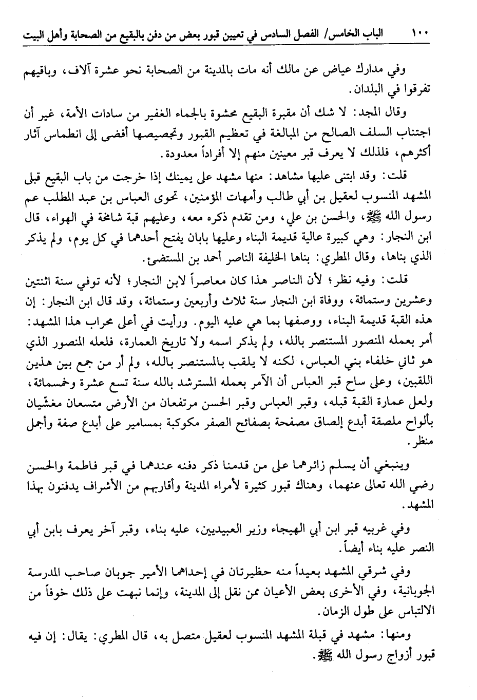 وينبغي أن يسلم زائرهما على من قدمنا ذكر دفنه عندهما في قبر فاطمة والحسن رضي الله تعالى عنهما، وهناك قبور كثيرة لأمراء المدينة وأقاربهم من الأشراف يدفنون بهذا المشهد.