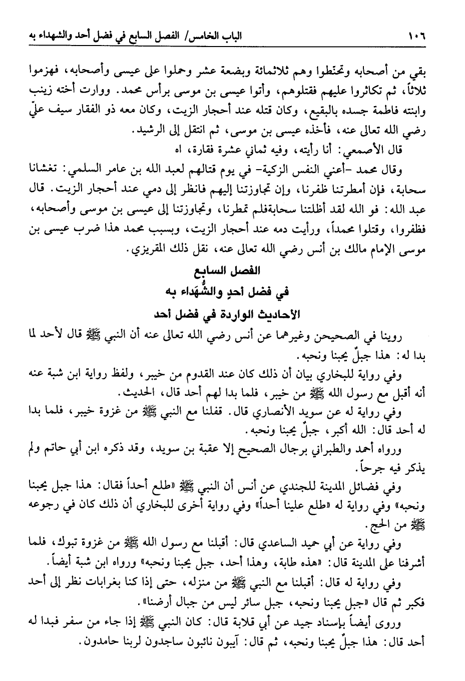 وفي رواية له عن سويد الأنصاري قال. قفلنا مع النبي صلى الله عليه وسلم من غزوة خيبر، فلما بدا له أحد قال: الله أكبر، جبل يحبنا ونحبه.