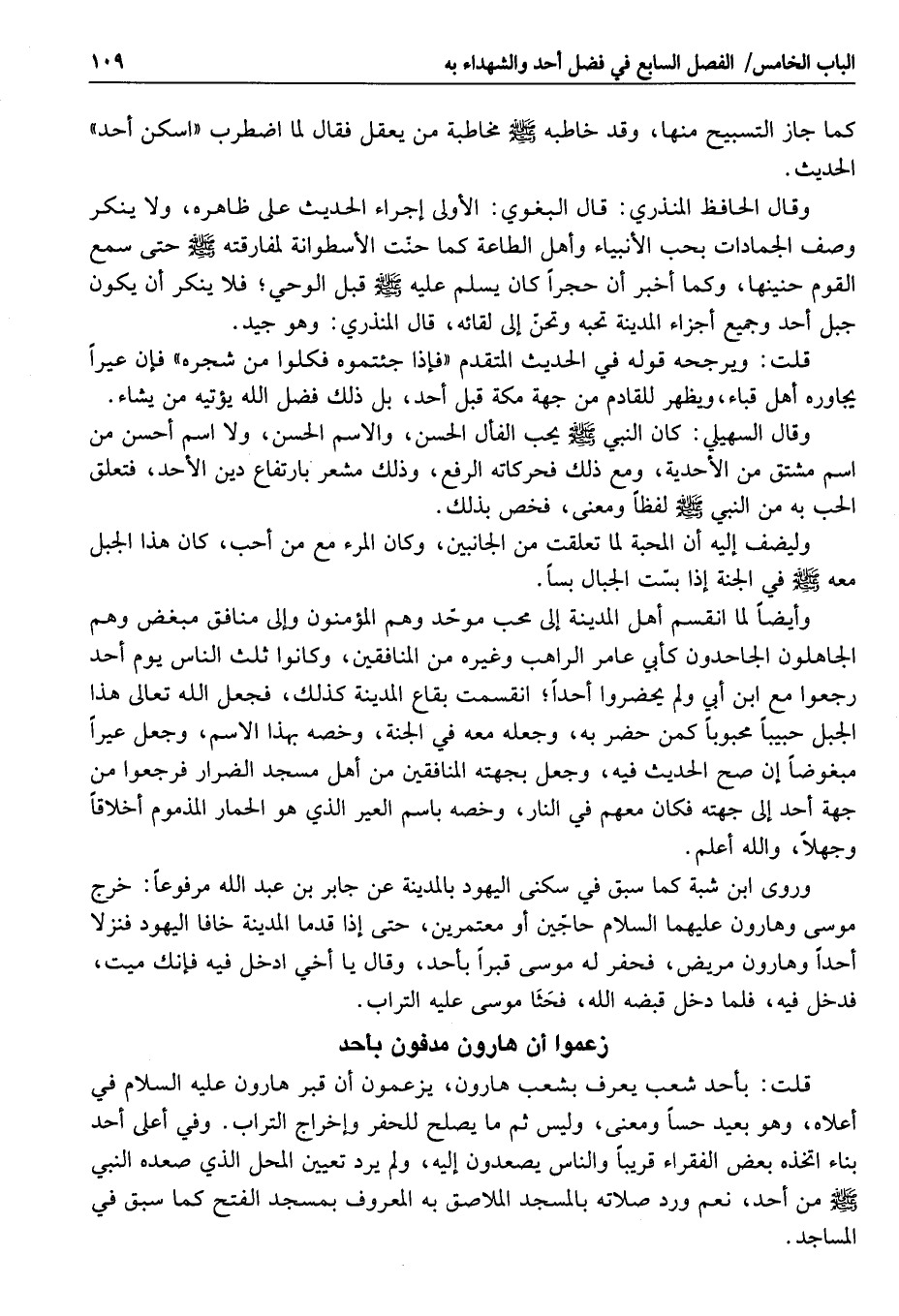 قلت: بأحد شعب يعرف بشعب هارون، يزعمون أن قبر هارون عليه السلام في أعلاه، وهو بعيد حسا ومعنى، وليس ثم ما يصلح للحفر وإخراج التراب. وفي أعلى أحد بناء اتخذه بعض الفقراء قريبا والناس يصعدون إليه، ولم يرد تعيين المحل الذي صعده النبي صلى الله عليه وسلم من أحد، نعم ورد صلاته بالمسجد الملاصق به المعروف بمسجد الفتح كما سبق في المساجد.