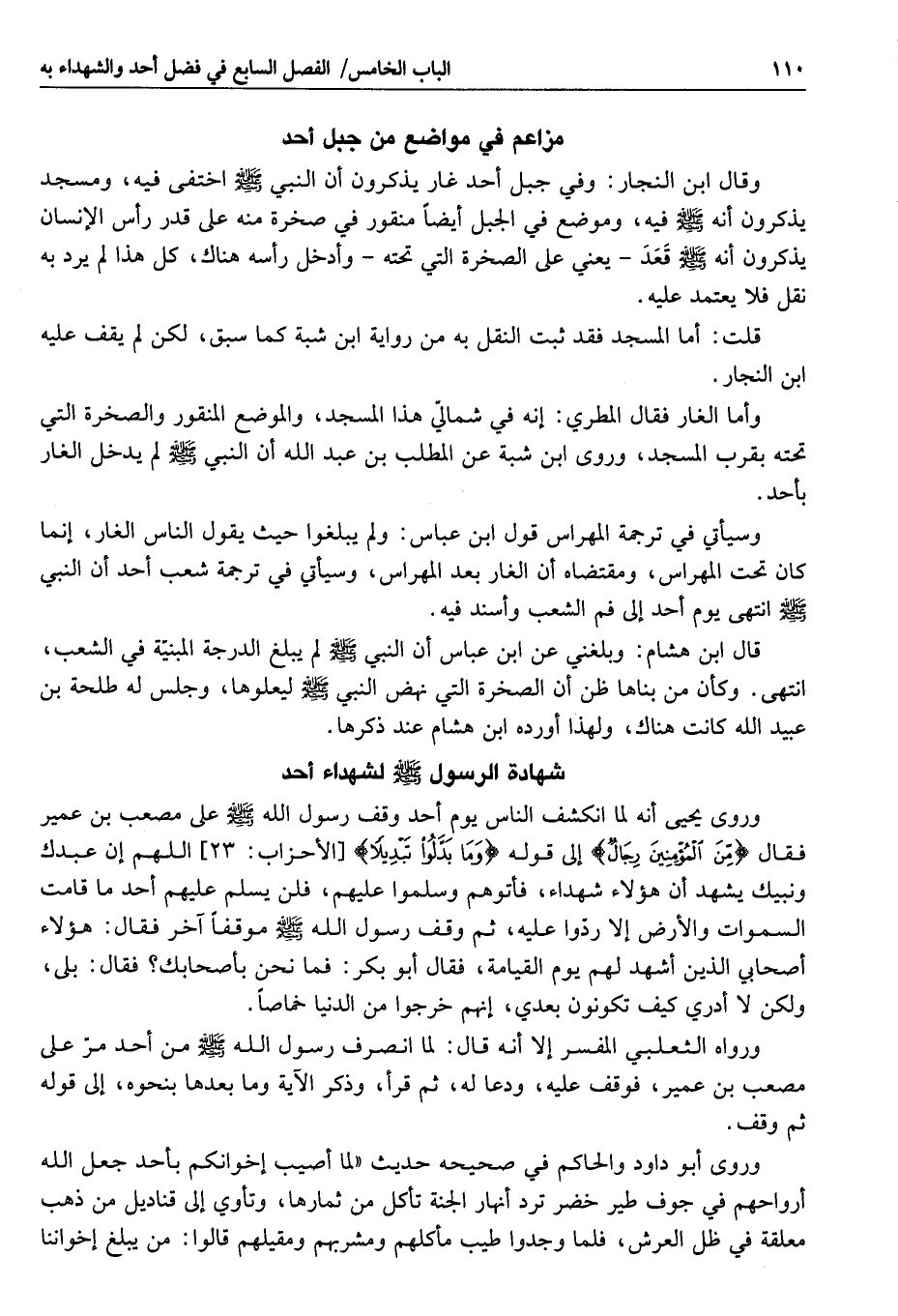 وقال ابن النجار: وفي جبل أحد غار يذكرون أن النبي صلى الله عليه وسلم اختفى فيه، ومسجد يذكرون أنه صلى الله عليه وسلم فيه، وموضع في الجبل أيضا منقور في صخرة منه على قدر رأس الإنسان يذكرون أنه صلى الله عليه وسلم قعد- يعني على الصخرة التي تحته- وأدخل رأسه هناك، كل هذا لم يرد به نقل فلا يعتمد عليه.