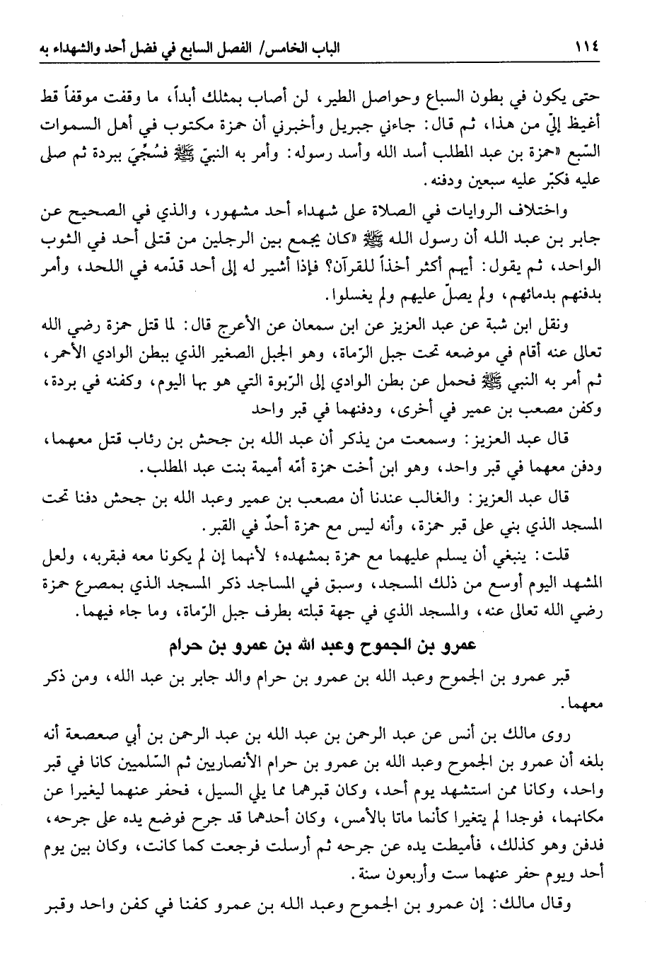 روى مالك بن أنس عن عبد الرحمن بن عبد الله بن عبد الرحمن بن أبي صعصعة أنه بلغه أن عمرو بن الجموح وعبد الله بن عمرو بن حرام الأنصاريين ثم السّلميين كانا في قبر واحد، وكانا ممن استشهد يوم أحد، وكان قبرهما مما يلي السيل، فحفر عنهما ليغيرا عن مكانهما، فوجدا لم يتغيرا كأنما ماتا بالأمس، وكان أحدهما قد جرح فوضع يده على جرحه، فدفن وهو كذلك، فأميطت يده عن جرحه ثم أرسلت فرجعت كما كانت، وكان بين يوم أحد ويوم حفر عنهما ست وأربعون سنة.