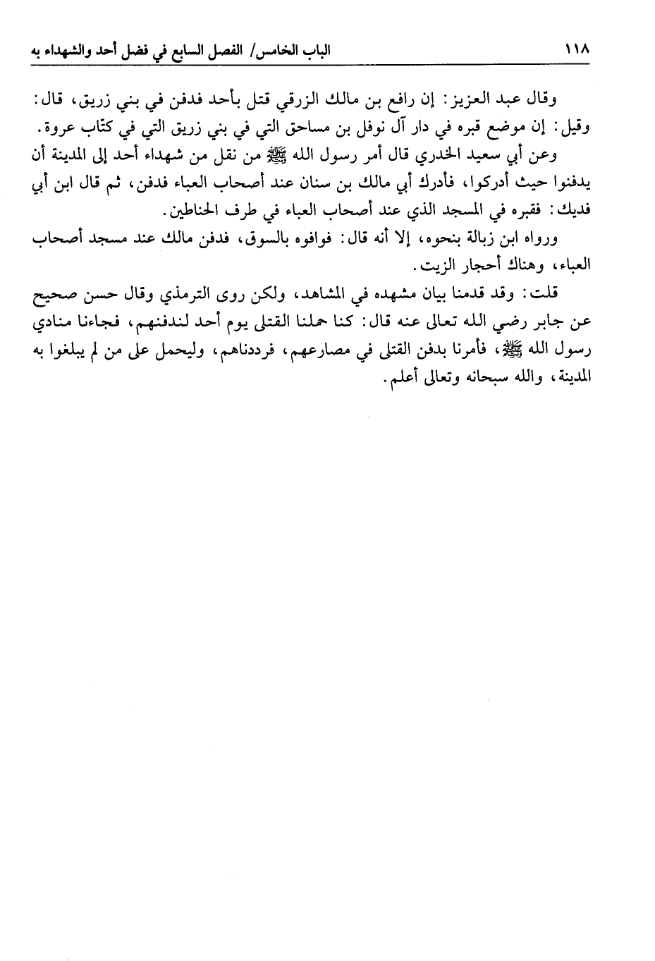 قلت: وقد قدمنا بيان مشهده في المشاهد، ولكن روى الترمذي وقال حسن صحيح عن جابر رضي الله تعالى عنه قال: كنا حملنا القتلى يوم أحد لندفنهم، فجاءنا منادي رسول الله صلى الله عليه وسلم، فأمرنا بدفن القتلى في مصارعهم، فرددناهم، وليحمل على من لم يبلغوا به المدينة، والله سبحانه وتعالى أعلم.