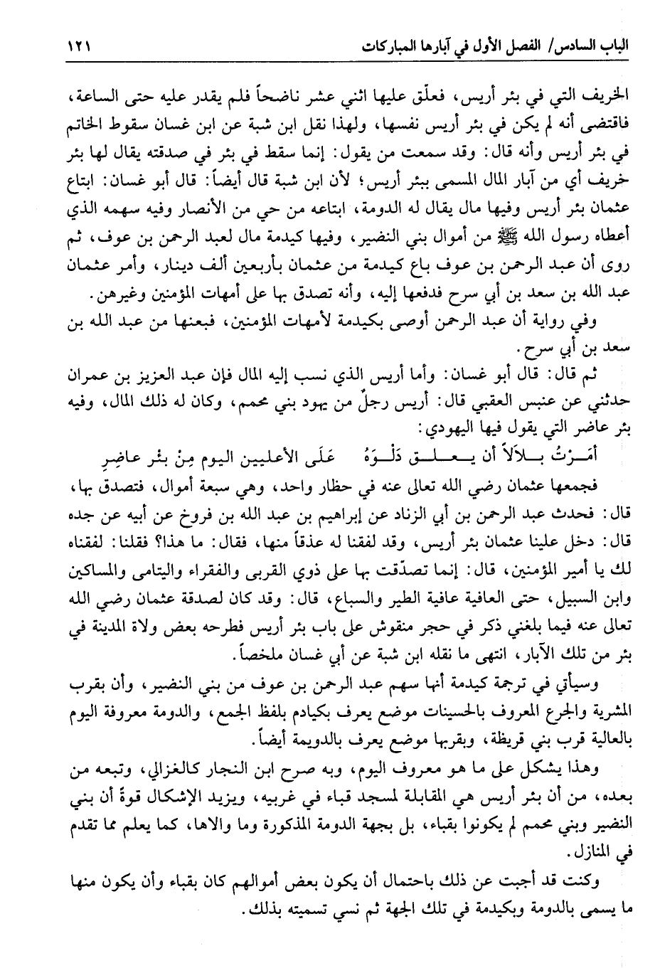 الخريف التي في بئر أريس، فعلّق عليها اثني عشر ناضحا فلم يقدر عليه حتى الساعة، فاقتضى أنه لم يكن في بئر أريس نفسها، ولهذا نقل ابن شبة عن ابن غسان سقوط الخاتم في بئر أريس وأنه قال: وقد سمعت من يقول: إنما سقط في بئر في صدقته يقال لها بئر خريف أي من آبار المال المسمى ببئر أريس؛ لأن ابن شبة قال أيضا: قال أبو غسان: ابتاع عثمان بئر أريس وفيها مال يقال له الدومة، ابتاعه من حي من الأنصار وفيه سهمه الذي أعطاه رسول الله صلى الله عليه وسلم من أموال بني النضير، وفيها كيدمة مال لعبد الرحمن بن عوف، ثم روى أن عبد الرحمن بن عوف باع كيدمة من عثمان بأربعين ألف دينار، وأمر عثمان عبد الله بن سعد بن أبي سرح فدفعها إليه، وأنه تصدق بها على أمهات المؤمنين وغيرهن.