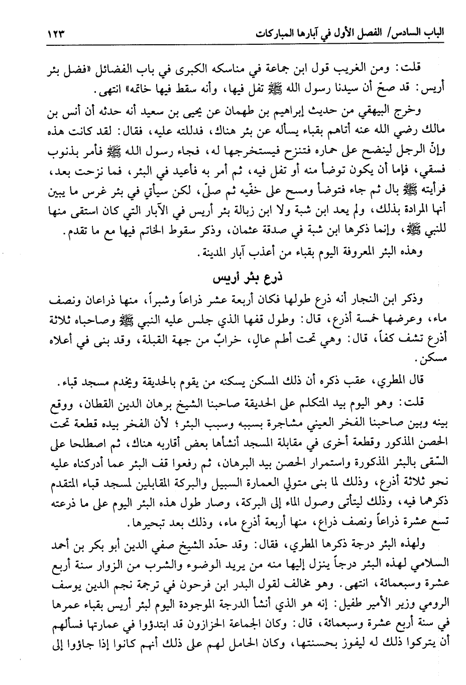 قلت: ومن الغريب قول ابن جماعة في مناسكه الكبرى في باب الفضائل «فضل بئر أريس: قد صحّ أن سيدنا رسول الله صلى الله عليه وسلم تفل فيها، وأنه سقط فيها خاتمه» انتهى.