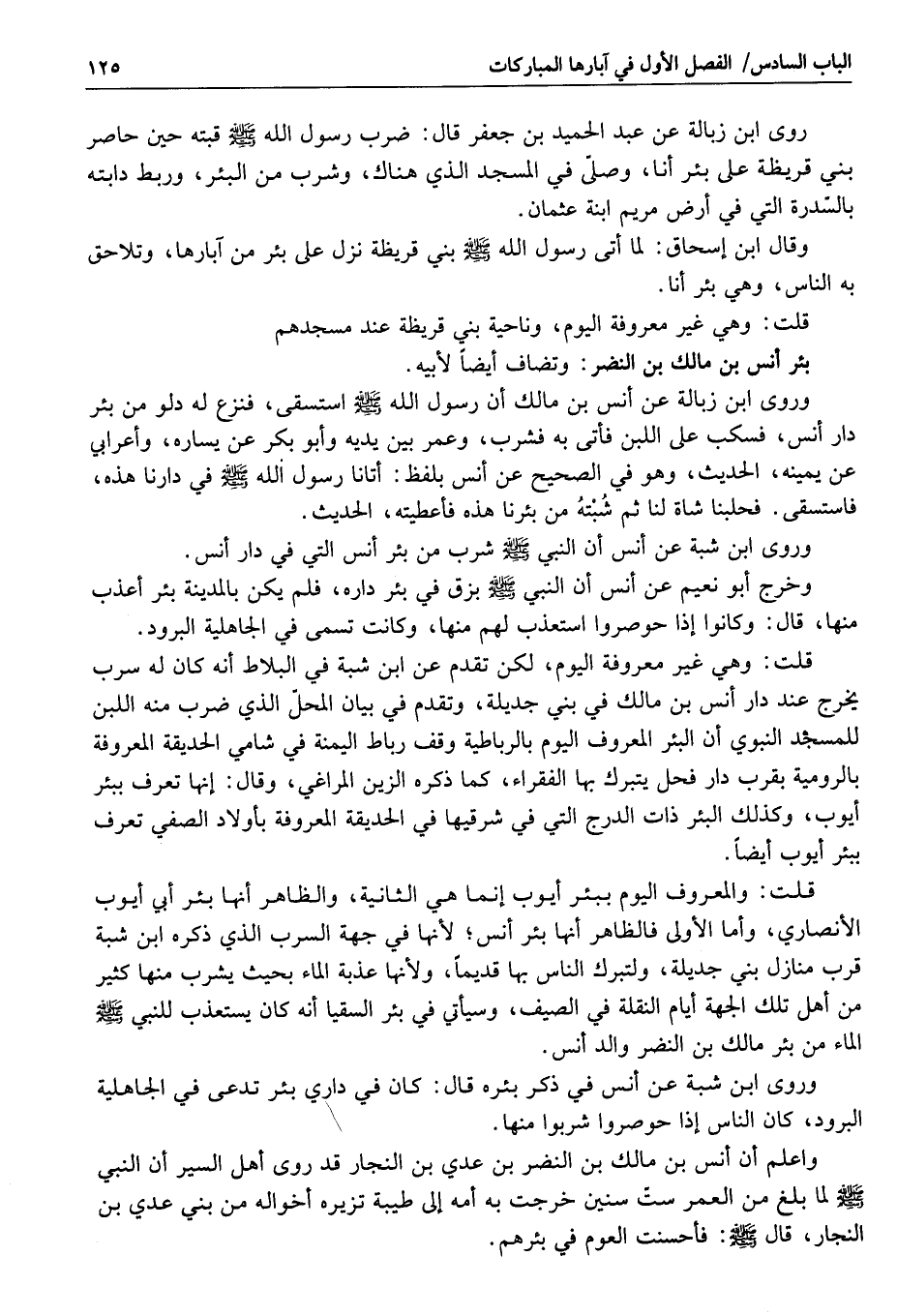 قلت: والمعروف اليوم ببئر أيوب إنما هي الثانية، والظاهر أنها بئر أبي أيوب الأنصاري، وأما الأولى فالظاهر أنها بئر أنس؛ لأنها في جهة السرب الذي ذكره ابن شبة قرب منازل بني جديلة، ولتبرك الناس بها قديما، ولأنها عذبة الماء بحيث يشرب منها كثير من أهل تلك الجهة أيام النقلة في الصيف، وسيأتي في بئر السقيا أنه كان يستعذب للنبي صلى الله عليه وسلم الماء من بئر مالك بن النضر والد أنس.