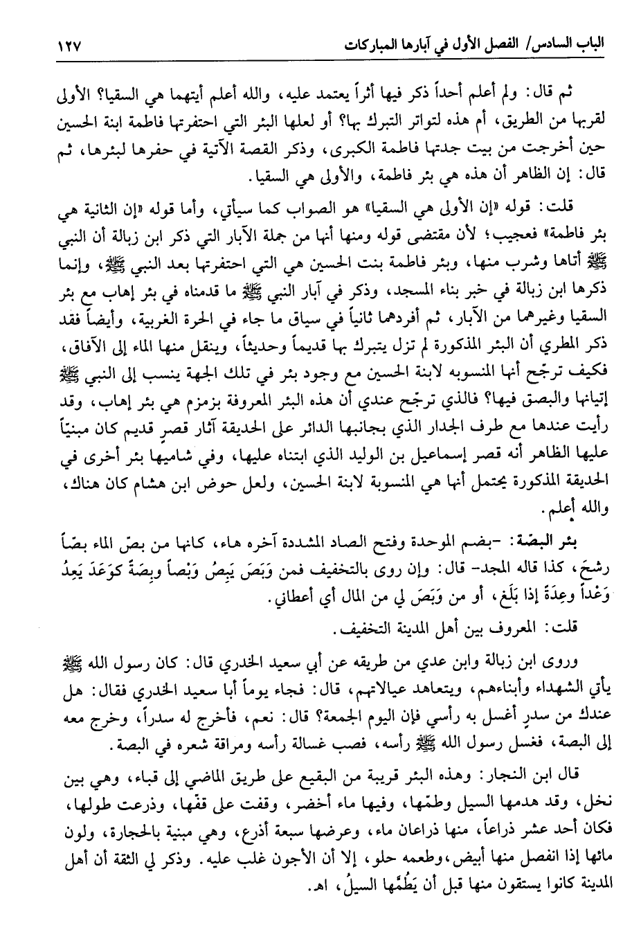 قلت: قوله «إن الأولى هي السقيا» هو الصواب كما سيأتي، وأما قوله «إن الثانية هي بئر فاطمة» فعجيب؛ لأن مقتضى قوله ومنها أنها من جملة الآبار التي ذكر ابن زبالة أن النبي صلى الله عليه وسلم أتاها وشرب منها، وبئر فاطمة بنت الحسين هي التي احتفرتها بعد النبي صلى الله عليه وسلم، وإنما ذكرها ابن زبالة في خبر بناء المسجد، وذكر في آبار النبي صلى الله عليه وسلم ما قدمناه في بئر إهاب مع بئر السقيا وغيرهما من الآبار، ثم أفردهما ثانيا في سياق ما جاء في الحرة الغربية، وأيضا فقد ذكر المطري أن البئر المذكورة لم تزل يتبرك بها قديما وحديثا، وينقل منها الماء إلى الآفاق، فكيف ترجّح أنها المنسوبه لابنة الحسين مع وجود بئر في تلك الجهة ينسب إلى النبي صلى الله عليه وسلم إتيانها والبصق فيها؟ فالذي ترجّح عندي أن هذه البئر المعروفة بزمزم هي بئر إهاب، وقد رأيت عندها مع طرف الجدار الذي بجانبها الدائر على الحديقة آثار قصر قديم كان مبنيّا عليها الظاهر أنه قصر إسماعيل بن الوليد الذي ابتناه عليها، وفي شاميها بئر أخرى في الحديقة المذكورة يحتمل أنها هي المنسوبة لابنة الحسين، ولعل حوض ابن هشام كان هناك، والله أعلم.