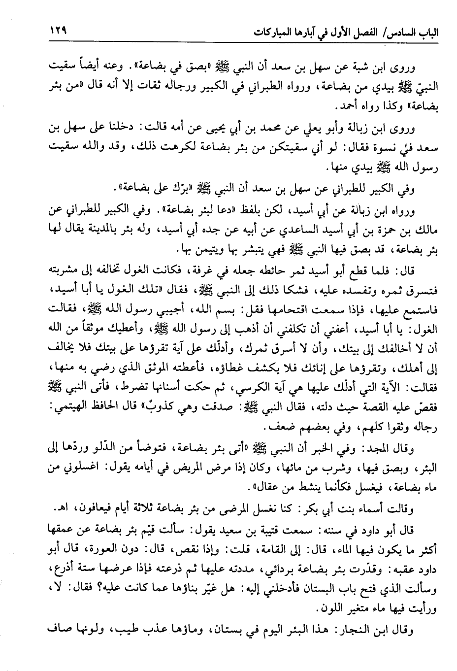 وفي الكبير للطبراني عن سهل بن سعد أن النبي صلى الله عليه وسلم «برّك على بضاعة» .