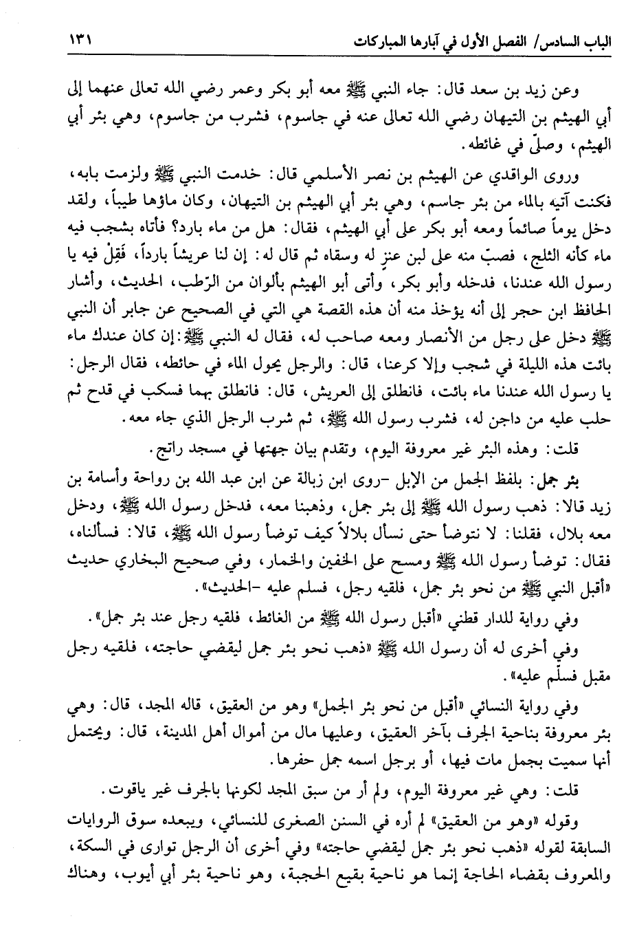 وعن زيد بن سعد قال: جاء النبي صلى الله عليه وسلم معه أبو بكر وعمر رضي الله تعالى عنهما إلى أبي الهيثم بن التيهان رضي الله تعالى عنه في جاسوم، فشرب من جاسوم، وهي بئر أبي الهيثم، وصلّى في غائطه.