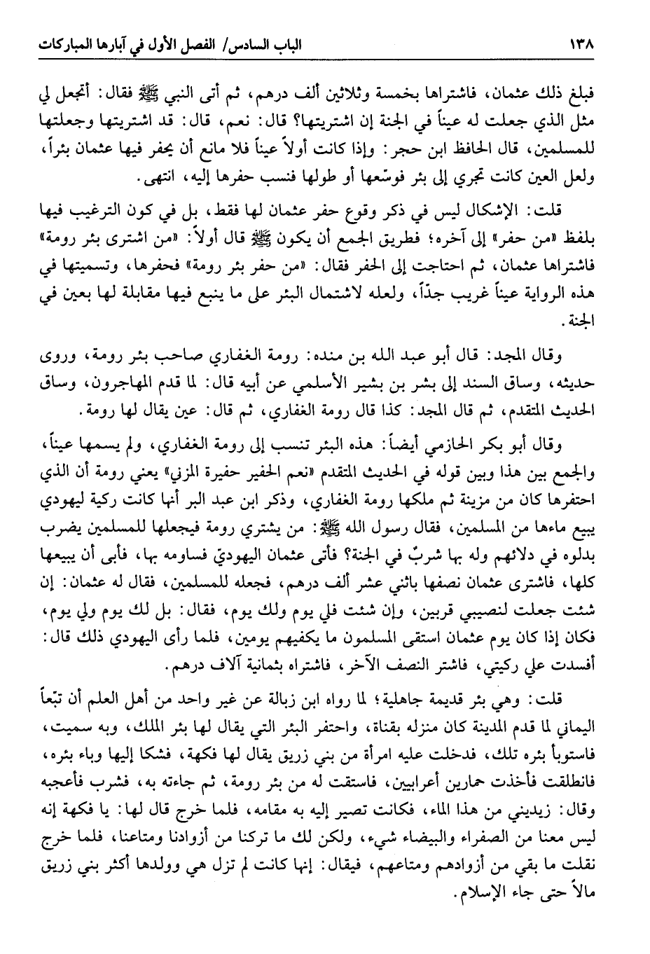 فبلغ ذلك عثمان، فاشتراها بخمسة وثلاثين ألف درهم، ثم أتى النبي صلى الله عليه وسلم فقال: أتجعل لي مثل الذي جعلت له عينا في الجنة إن اشتريتها؟ قال: نعم، قال: قد اشتريتها وجعلتها للمسلمين، قال الحافظ ابن حجر: وإذا كانت أولا عينا فلا مانع أن يحفر فيها عثمان بئرا، ولعل العين كانت تجري إلى بئر فوسّعها أو طولها فنسب حفرها إليه، انتهى.