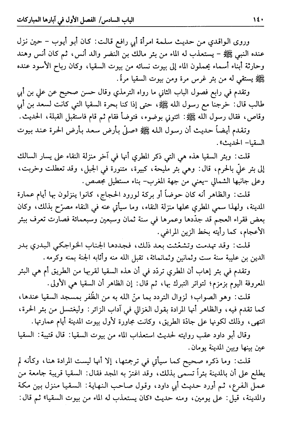قلت: وما ذكره صحيح كما سيأتي في ترجمتها، إلا أنها ليست المرادة هنا، وكأنه لم يطلع على أن بالمدينة بئرا تسمى بذلك، وقد اغترّ به المجد فقال: السقيا قريبة جامعة من عمل الفرع، ثم أورد حديث أبي داود، وقول صاحب النهاية: السقيا منزل بين مكة والمدينة، قيل: على يومين، ومنه حديث «كان يستعذب له الماء من بيوت السقيا» ثم قال: