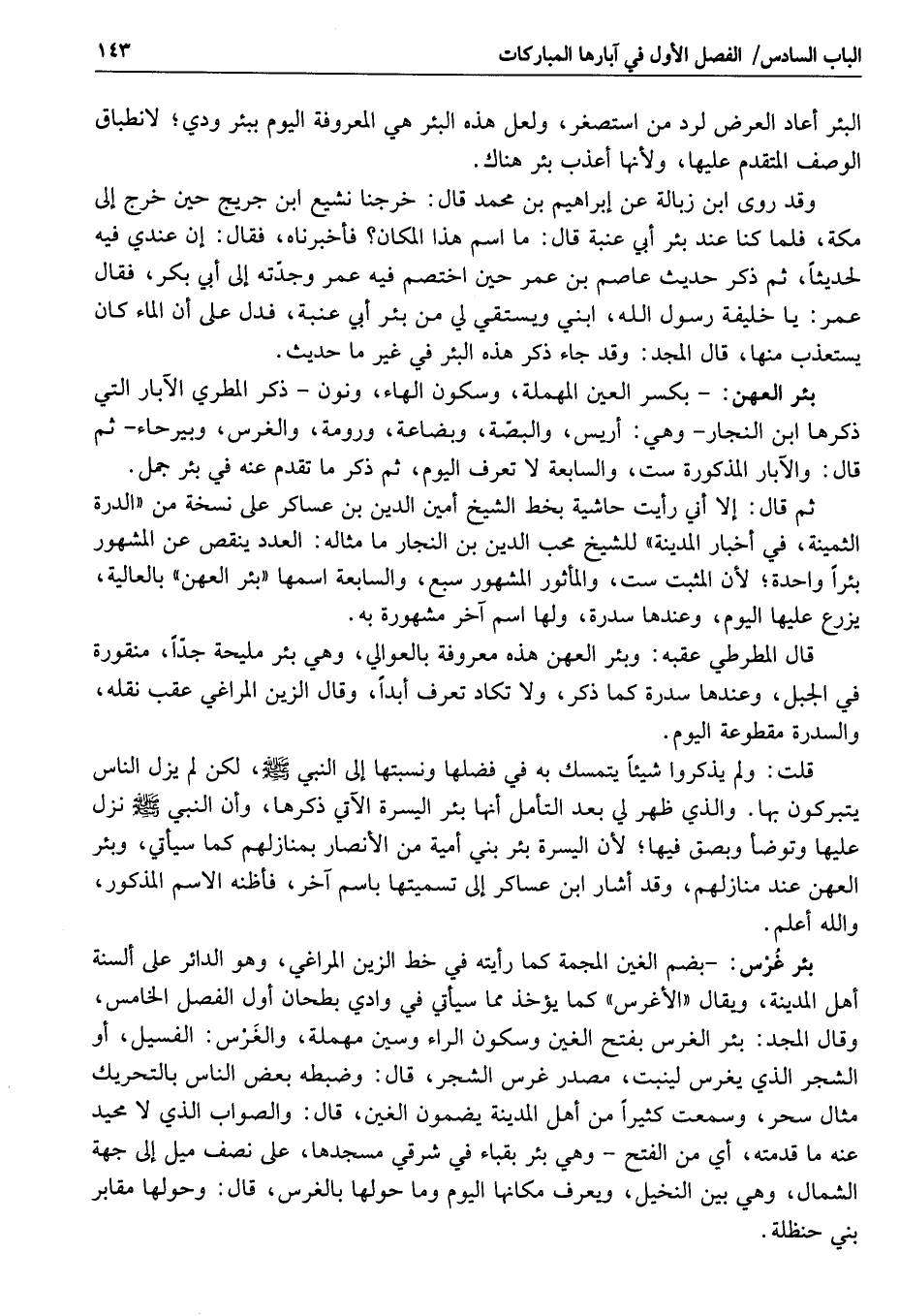 ثم قال: إلا أني رأيت حاشية بخط الشيخ أمين الدين بن عساكر على نسخة من «الدرة الثمينة، في أخبار المدينة» للشيخ محب الدين بن النجار ما مثاله: العدد ينقص عن المشهور بئرا واحدة؛ لأن المثبت ست، والمأثور المشهور سبع، والسابعة اسمها «بئر العهن» بالعالية، يزرع عليها اليوم، وعندها سدرة، ولها اسم آخر مشهورة به.