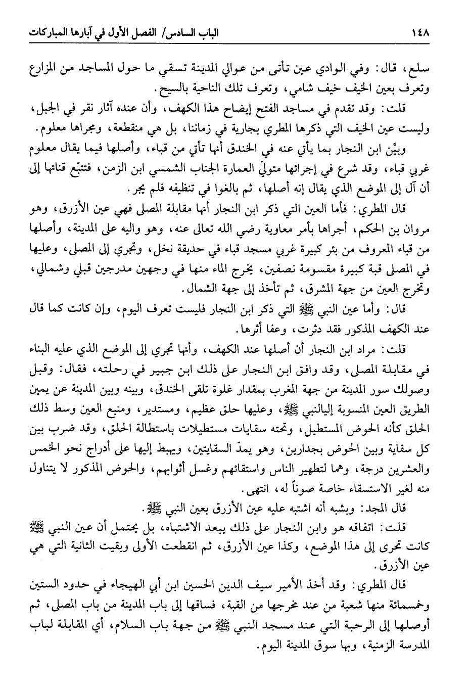 قلت: اتفاقه هو وابن النجار على ذلك يبعد الاشتباه، بل يحتمل أن عين النبي صلى الله عليه وسلم كانت تحرى إلى هذا الموضع، وكذا عين الأزرق، ثم انقطعت الأولى وبقيت الثانية التي هي عين الأزرق.