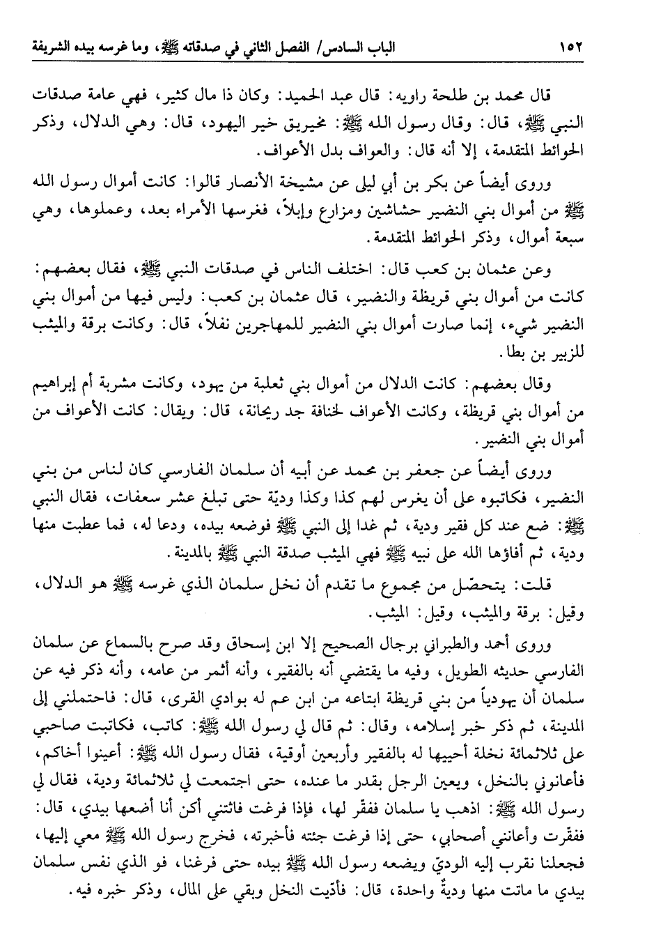 وروى أيضا عن جعفر بن محمد عن أبيه أن سلمان الفارسي كان لناس من بني النضير، فكاتبوه على أن يغرس لهم كذا وكذا وديّة حتى تبلغ عشر سعفات، فقال النبي صلى الله عليه وسلم: ضع عند كل فقير ودية، ثم غدا إلى النبي صلى الله عليه وسلم فوضعه بيده، ودعا له، فما عطبت منها ودية، ثم أفاؤها الله على نبيه صلى الله عليه وسلم فهي الميثب صدقة النبي صلى الله عليه وسلم بالمدينة.