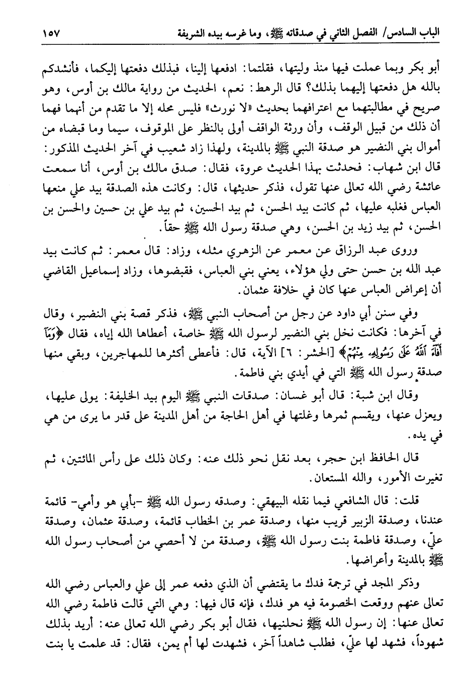 قلت: قال الشافعي فيما نقله البيهقي: وصدقه رسول الله صلى الله عليه وسلم- بأبي هو وأمي- قائمة عندنا، وصدقة الزبير قريب منها، وصدقة عمر بن الخطاب قائمة، وصدقة عثمان، وصدقة عليّ، وصدقة فاطمة بنت رسول الله صلى الله عليه وسلم، وصدقة من لا أحصي من أصحاب رسول الله صلى الله عليه وسلم بالمدينة وأعراضها.