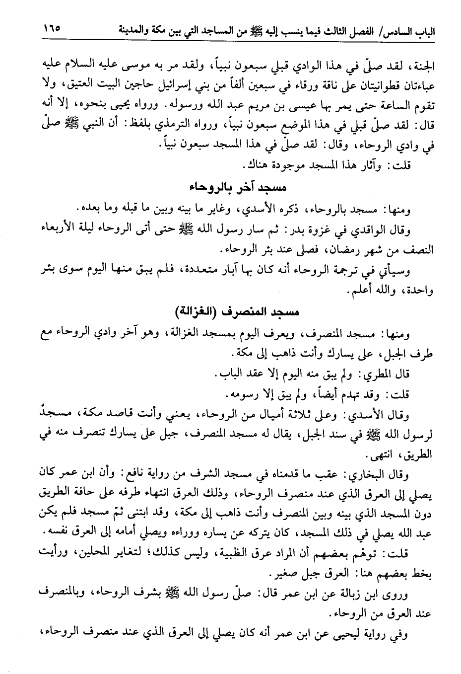 وقال البخاري: عقب ما قدمناه في مسجد الشرف من رواية نافع: وأن ابن عمر كان يصلي إلى العرق الذي عند منصرف الروحاء، وذلك العرق انتهاء طرفه على حافة الطريق دون المسجد الذي بينه وبين المنصرف وأنت ذاهب إلى مكة، وقد ابتنى ثمّ مسجد فلم يكن عبد الله يصلي في ذلك المسجد، كان يتركه عن يساره ووراءه ويصلي أمامه إلى العرق نفسه.