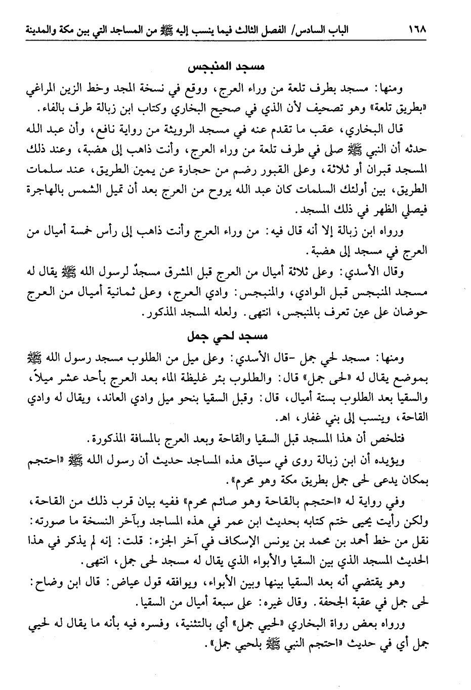 ويؤيده أن ابن زبالة روى في سياق هذه المساجد حديث أن رسول الله صلى الله عليه وسلم «احتجم بمكان يدعى لحى جمل بطريق مكة وهو محرم» .