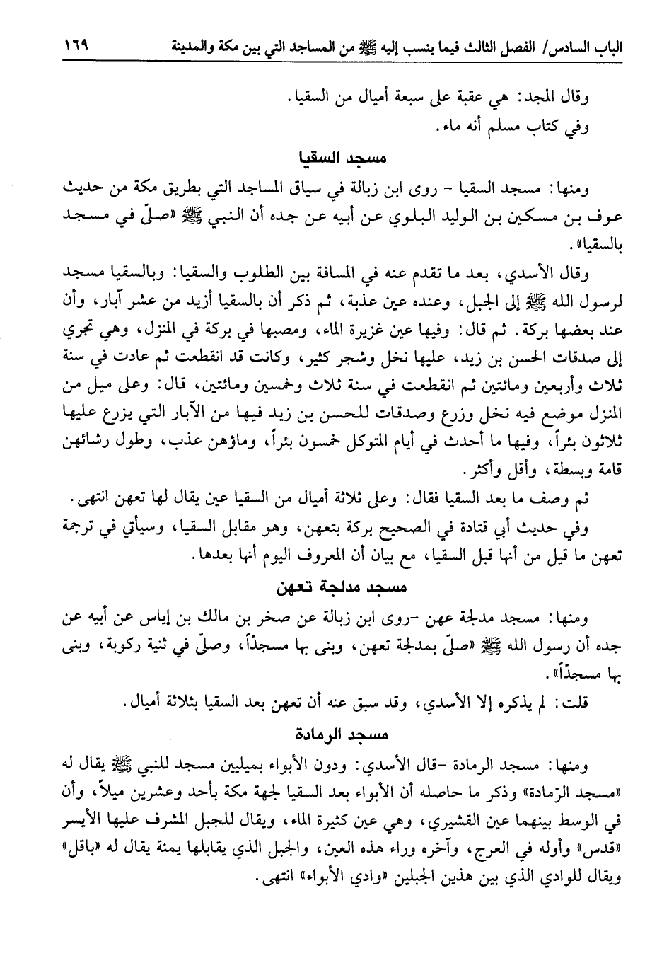 ومنها: مسجد السقيا- روى ابن زبالة في سياق المساجد التي بطريق مكة من حديث عوف بن مسكين بن الوليد البلوي عن أبيه عن جده أن النبي صلى الله عليه وسلم «صلّى في مسجد بالسقيا» .