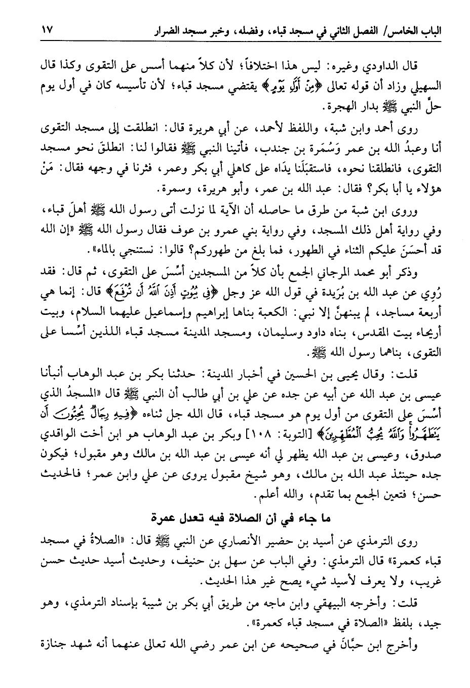 قلت: وقال يحيى بن الحسين في أخبار المدينة: حدثنا بكر بن عبد الوهاب أنبأنا عيسى بن عبد الله عن أبيه عن جده عن علي بن أبي طالب أن النبي صلى الله عليه وسلم قال «المسجد الذي أسّس على التقوى من أول يوم هو مسجد قباء، قال الله جل ثناءه فِيهِ رِجالٌ يُحِبُّونَ أَنْ يَتَطَهَّرُوا وَاللَّهُ يُحِبُّ الْمُطَّهِّرِينَ [التوبة: 108] وبكر بن عبد الوهاب هو ابن أخت الواقدي صدوق، وعيسى بن عبد الله يظهر لي أنه عيسى بن عبد الله بن مالك وهو مقبول؛ فيكون جده حينئذ عبد الله بن مالك، وهو شيخ مقبول يروى عن علي وابن عمر؛ فالحديث حسن؛ فتعين الجمع بما تقدم، والله أعلم.