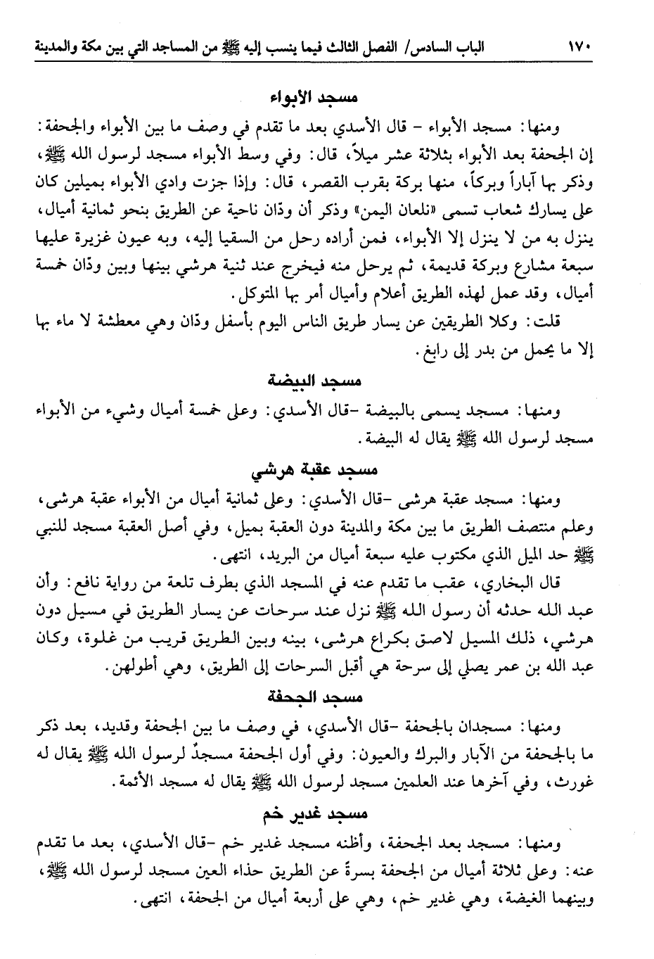 ومنها: مسجد بعد الجحفة، وأظنه مسجد غدير خم- قال الأسدي، بعد ما تقدم عنه: وعلى ثلاثة أميال من الجحفة بسرة عن الطريق حذاء العين مسجد لرسول الله صلى الله عليه وسلم، وبينهما الغيضة، وهي غدير خم، وهي على أربعة أميال من الجحفة، انتهى.