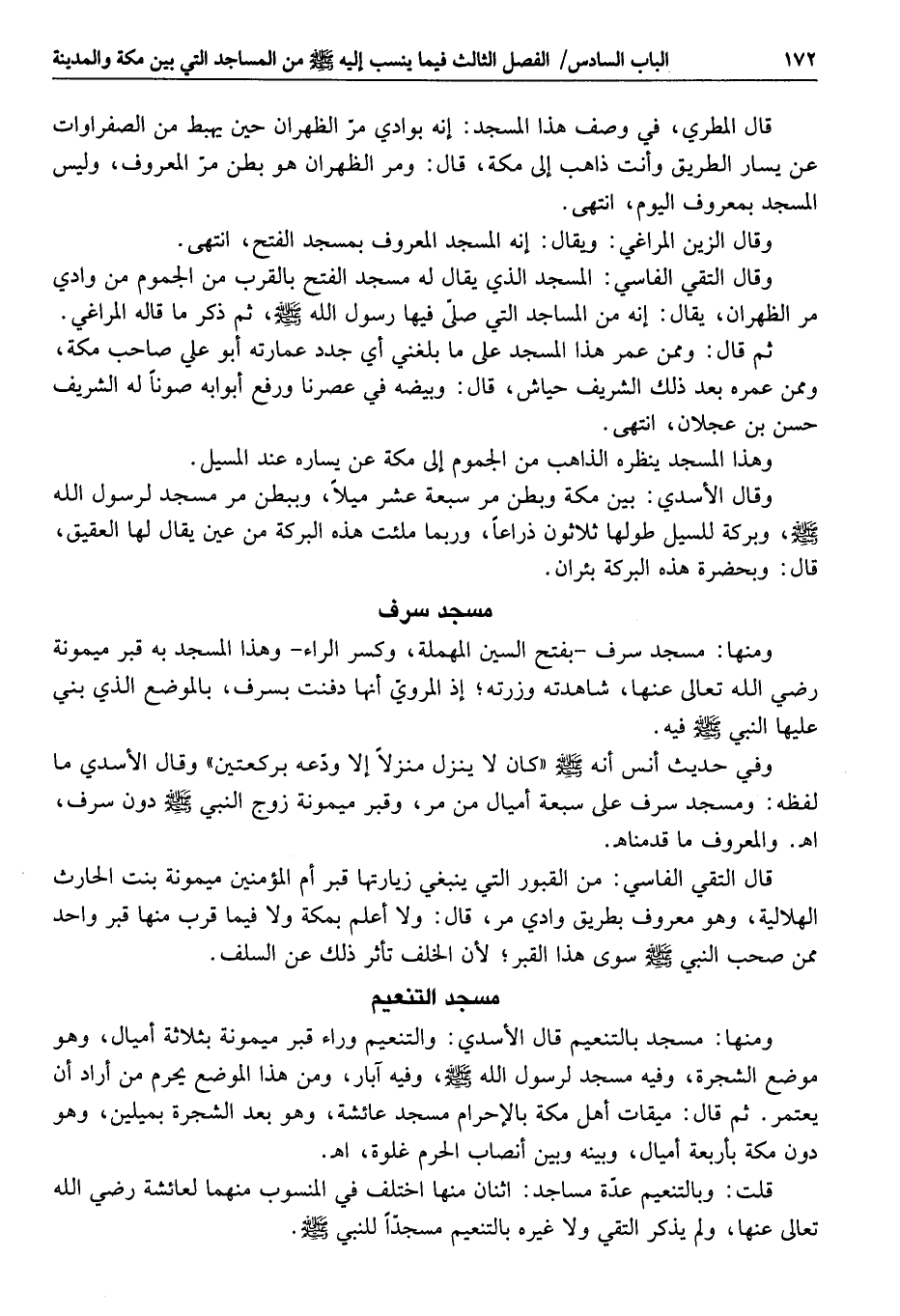 قلت: وبالتنعيم عدّة مساجد: اثنان منها اختلف في المنسوب منهما لعائشة رضي الله تعالى عنها، ولم يذكر التقي ولا غيره بالتنعيم مسجدّا للنبي صلى الله عليه وسلم.