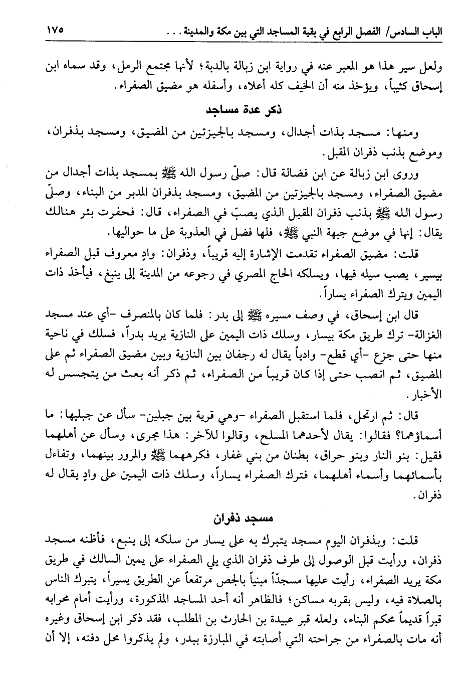 قلت: وبذفران اليوم مسجد يتبرك به على يسار من سلكه إلى ينبع، فأظنه مسجد ذفران، ورأيت قبل الوصول إلى طرف ذفران الذي يلي الصفراء على يمين السالك في طريق مكة يريد الصفراء، رأيت عليها مسجدّا مبنيا بالجص مرتفعا عن الطريق يسيرا، يتبرك الناس بالصلاة فيه، وليس بقربه مساكن؛ فالظاهر أنه أحد المساجد المذكورة، ورأيت أمام محرابه قبرا قديما محكم البناء، ولعله قبر عبيدة بن الحارث بن المطلب، فقد ذكر ابن إسحاق وغيره أنه مات بالصفراء من جراحته التي أصابته في المبارزة ببدر، ولم يذكروا محل دفنه، إلا أن
