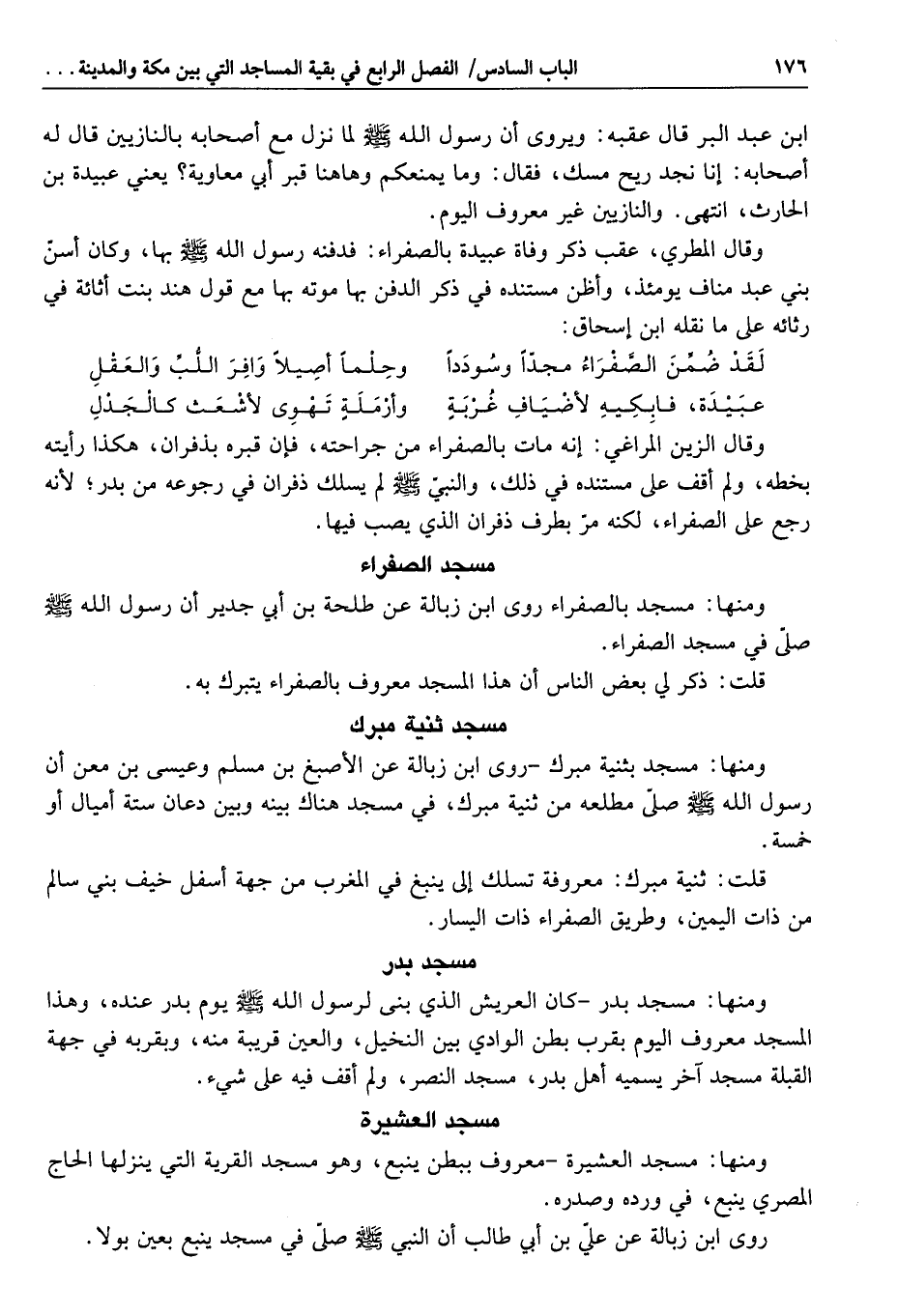 ومنها: مسجد بالصفراء روى ابن زبالة عن طلحة بن أبي جدير أن رسول الله صلى الله عليه وسلم صلّى في مسجد الصفراء.