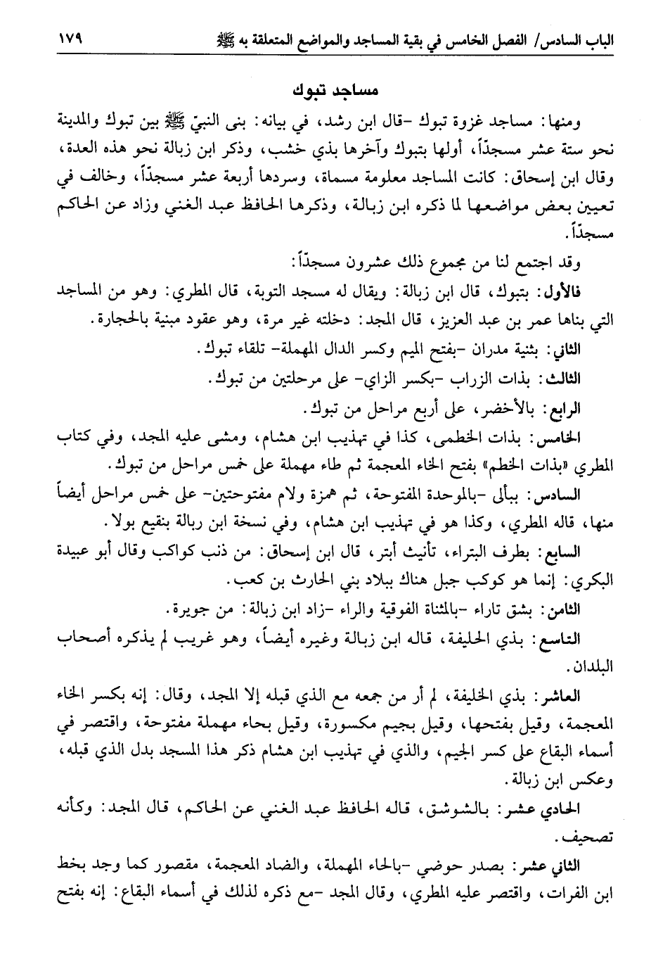 ومنها: مساجد غزوة تبوك- قال ابن رشد، في بيانه: بنى النبيّ صلى الله عليه وسلم بين تبوك والمدينة نحو ستة عشر مسجدّا، أولها بتبوك وآخرها بذي خشب، وذكر ابن زبالة نحو هذه العدة، وقال ابن إسحاق: كانت المساجد معلومة مسماة، وسردها أربعة عشر مسجدّا، وخالف في تعيين بعض مواضعها لما ذكره ابن زبالة، وذكرها الحافظ عبد الغني وزاد عن الحاكم مسجدّا.
