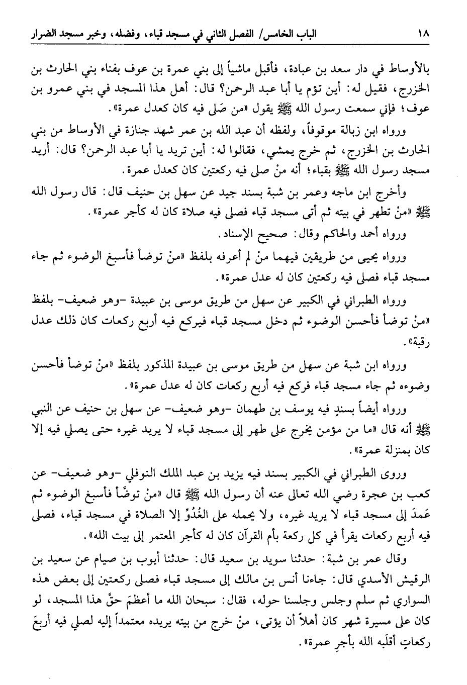 وأخرج ابن ماجه وعمر بن شبة بسند جيد عن سهل بن حنيف قال: قال رسول الله صلى الله عليه وسلم «من تطهر في بيته ثم أتى مسجد قباء فصلى فيه صلاة كان له كأجر عمرة» .