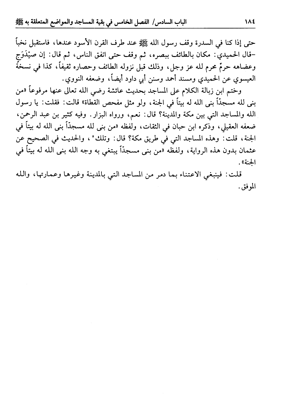 وختم ابن زبالة الكلام على المساجد بحديث عائشة رضي الله تعالى عنها مرفوعا «من بنى لله مسجدّا بنى الله له بيتا في الجنة، ولو مثل مفحص القطاة» قالت: فقلت: يا رسول الله والمساجد التي بين مكة والمدينة؟ قال: نعم، ورواه البزار. وفيه كثير بن عبد الرحمن، ضعفه العقيلي، وذكره ابن حبان في الثقات، ولفظه «من بنى لله مسجدّا بنى الله له بيتا في الجنة، قلت: وهذه المساجد التي في طريق مكة؟ قال: وتلك، والحديث في الصحيح عن عثمان بدون هذه الرواية، ولفظه «من بنى مسجدّا يبتغي به وجه الله بنى الله له بيتا في الجنة» .