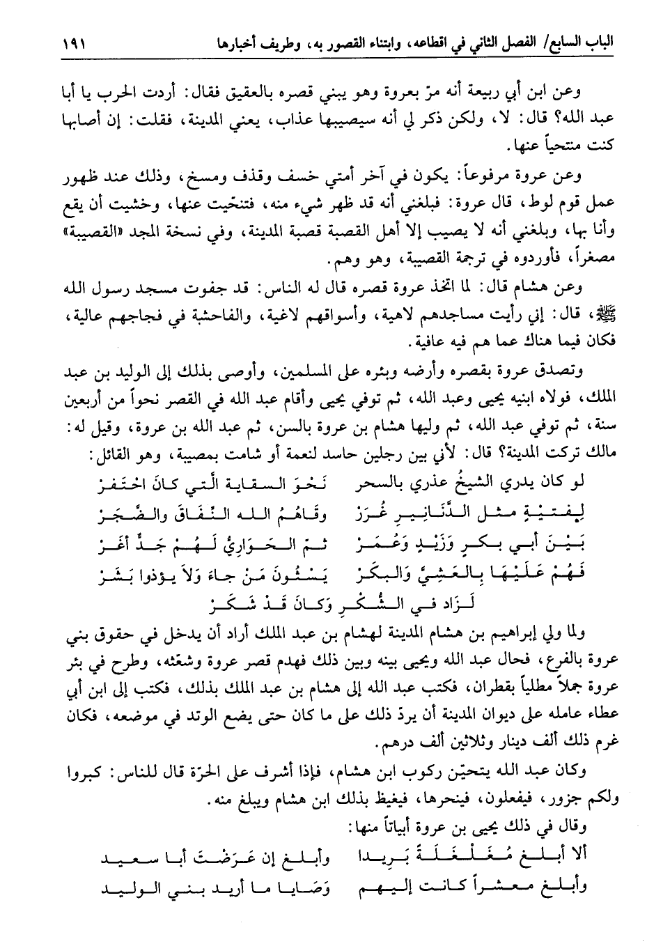 وعن ابن أبي ربيعة أنه مرّ بعروة وهو يبني قصره بالعقيق فقال: أردت الحرب يا أبا عبد الله؟ قال: لا، ولكن ذكر لي أنه سيصيبها عذاب، يعني المدينة، فقلت: إن أصابها كنت منتحيا عنها.