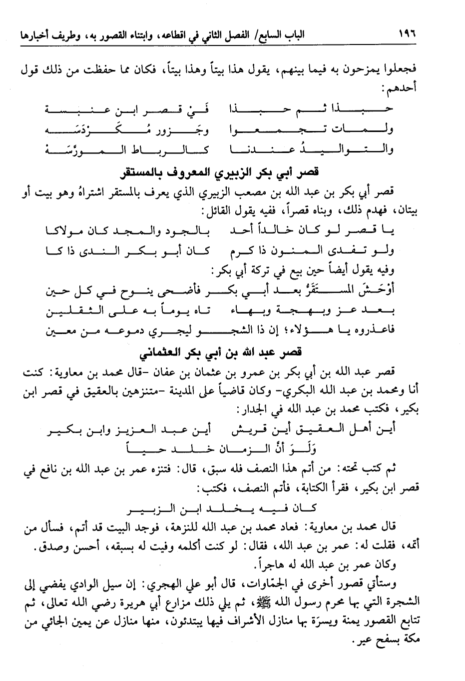 قصر أبي بكر بن عبد الله بن مصعب الزبيري الذي يعرف بالمستقر اشتراه وهو بيت أو بيتان، فهدم ذلك، وبناه قصرا، ففيه يقول القائل: