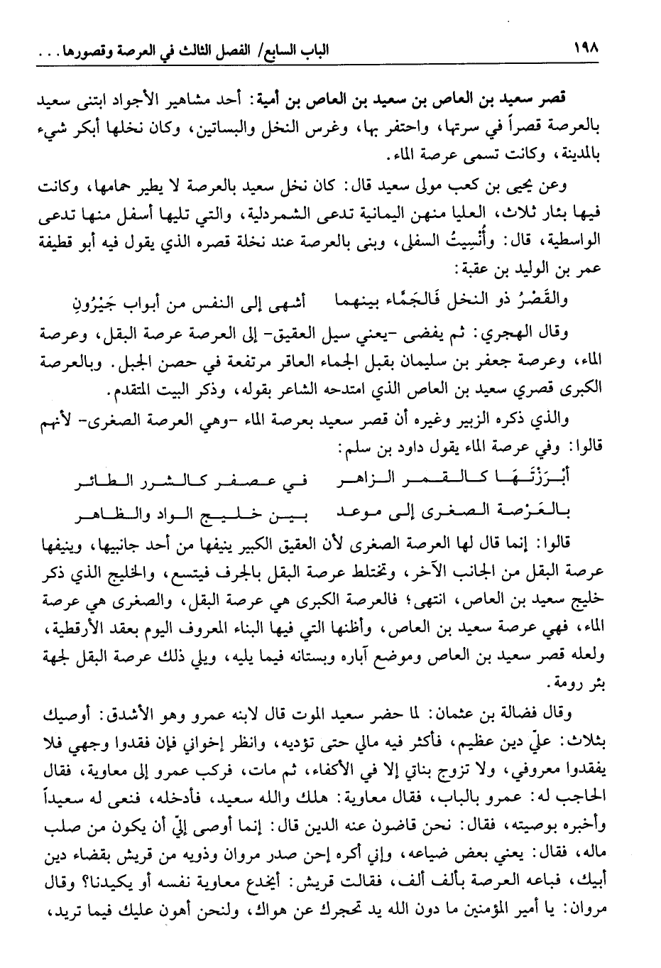 قصر سعيد بن العاص بن سعيد بن العاص بن أمية: أحد مشاهير الأجواد ابتنى سعيد بالعرصة قصرا في سرتها، واحتفر بها، وغرس النخل والبساتين، وكان نخلها أبكر شيء بالمدينة، وكانت تسمى عرصة الماء.