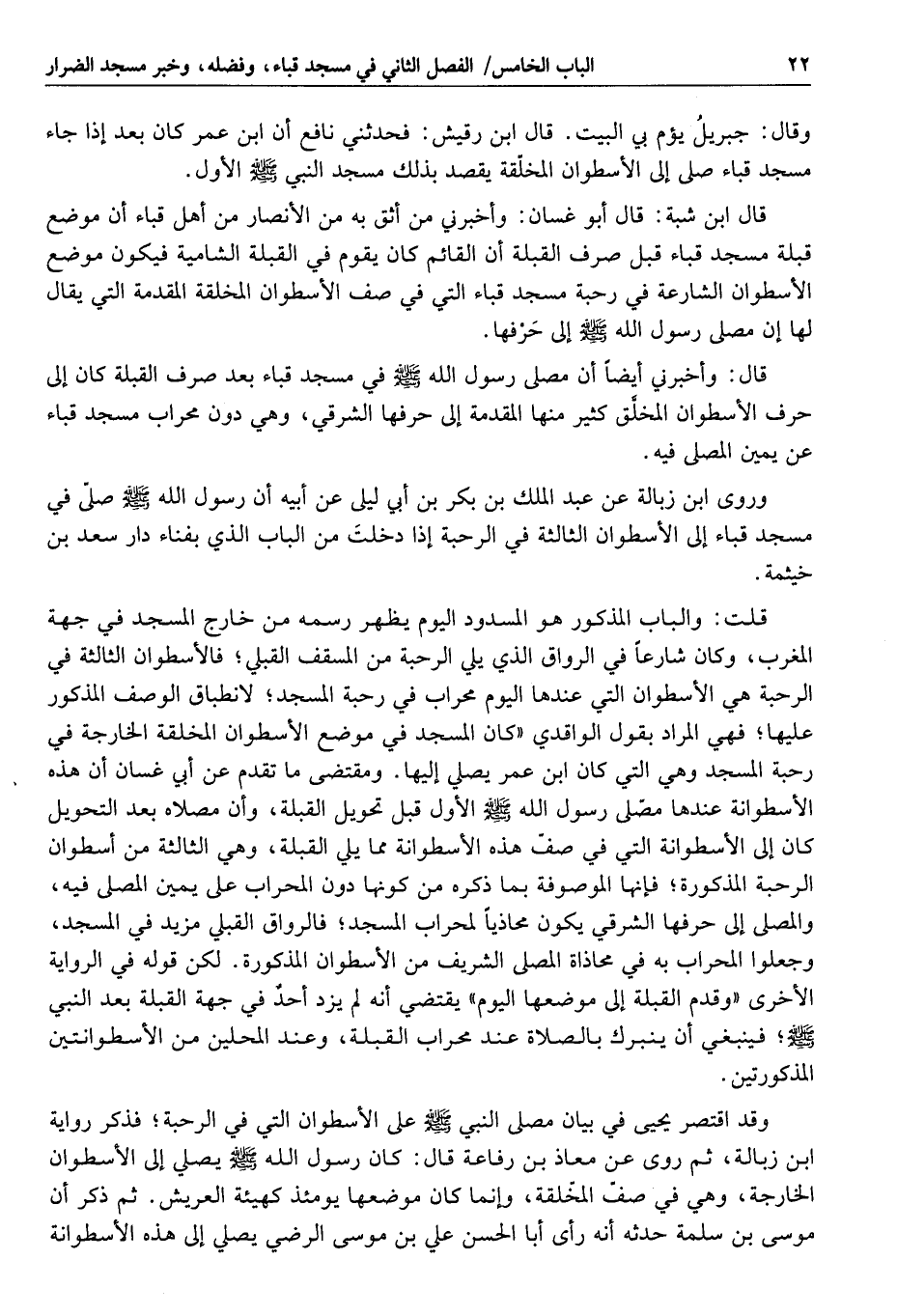 قلت: والباب المذكور هو المسدود اليوم يظهر رسمه من خارج المسجد في جهة المغرب، وكان شارعا في الرواق الذي يلي الرحبة من المسقف القبلي؛ فالأسطوان الثالثة في الرحبة هي الأسطوان التي عندها اليوم محراب في رحبة المسجد؛ لانطباق الوصف المذكور عليها؛ فهي المراد بقول الواقدي «كان المسجد في موضع الأسطوان المخلقة الخارجة في رحبة المسجد وهي التي كان ابن عمر يصلي إليها. ومقتضى ما تقدم عن أبي غسان أن هذه الأسطوانة عندها مصّلى رسول الله صلى الله عليه وسلم الأول قبل تحويل القبلة، وأن مصلاه بعد التحويل كان إلى الأسطوانة التي في صفّ هذه الأسطوانة مما يلي القبلة، وهي الثالثة من أسطوان الرحبة المذكورة؛ فإنها الموصوفة بما ذكره من كونها دون المحراب على يمين المصلى فيه، والمصلى إلى حرفها الشرقي يكون محاذيا لمحراب المسجد؛ فالرواق القبلي مزيد في المسجد، وجعلوا المحراب به في محاذاة المصلى الشريف من الأسطوان المذكورة. لكن قوله في الرواية الآخرى «وقدم القبلة إلى موضعها اليوم» يقتضي أنه لم يزد أحد في جهة القبلة بعد النبي صلى الله عليه وسلم؛ فينبغي أن ينبرك بالصلاة عند محراب القبلة، وعند المحلين من الأسطوانتين المذكورتين.