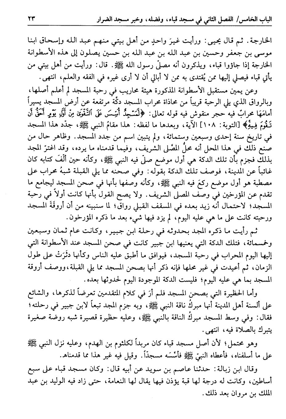 الخارجة. ثم قال يحيى: ورأيت غير واحد من أهل بيتي منهم عبد الله وإسحاق ابنا موسى بن جعفر وحسين بن عبد الله بن عبد الله بن حسين يصلون إلى هذه الأسطوانة الخارجة إذا جاؤوا قباء، ويذكرون أنه مصلّى رسول الله صلى الله عليه وسلم. قال: ورأيت من أهل بيتي من يأتي قباء فيصلي إليها ممن يقتدى به ممن لا أبالي أن لا أرى غيره في الفقه والعلم، انتهى.