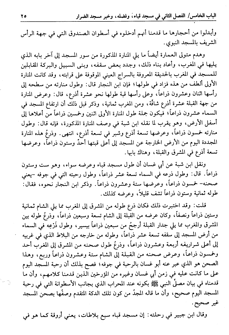 قلت: وقد اختبرت ذلك فكان ذرع طوله من المشرق إلى المغرب مما يلي الشام ثمانية وستين ذراعا ونصفا، وكان عرضه من القبلة إلى الشام تسعة وسبعين ذراعا، وذرع طوله بين المشرق والمغرب مما يلي جدار القبلة أرجح من سبعين ذراعا بيسير، وطول ذرعه في السماء من أرض المسجد إلى سقفه تسعة عشر ذراعا، وطوله من خارجه من البلاط الذي في غربيه إلى أعلى شراريفه أربعة وعشرون ذراعا، وذرع طول صحنه من المشرق إلى المغرب أحد وخمسون ذراعا، وعرض صحنه من القبلة إلى الشام ستة وعشرون ذراعا وربع، وهذا الصحن هو الذي عبر عنه أبو غسان بالرحبة في جوفه؛ فصح بذلك أن رحبة المسجد اليوم على ما كانت عليه في زمن أبي غسان وغيره من المؤرخين الذين قدمنا كلامهم، وأن ما قدمناه في بيان مصلّى النبي صلى الله عليه وسلم بكونه عند المحراب الذي بجانب الأسطوانة التي في رحبة المسجد اليوم صحيح، وأن ما قاله المجد من كون تلك الدكة المتقدم وصفها بصحن المسجد غير صحيح.