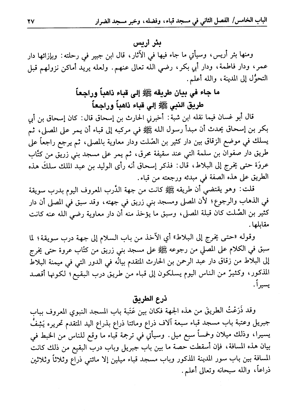 وقد ذرعت الطريق من هذه الجهة فكان بين عتبة باب المسجد النبوي المعروف بباب جبريل وعتبة باب مسجد قباء سبعة آلاف ذراع ومائتا ذراع بذراع اليد المتقدم تحريره يشفّ يسيرا، وذلك ميلان وخمسا سبع ميل. وسيأتي في ترجمة قباء ما وقع للناس من الخبط في بيان هذه المسافة، فإن أسقطت حصة ما بين باب جبريل وباب درب البقيع من ذلك كانت المسافة بين باب سور المدينة المذكور وباب مسجد قباء ميلين إلا مائتي ذراع وثلاثا وثلاثين ذراعا، والله سبحانه وتعالى أعلم.