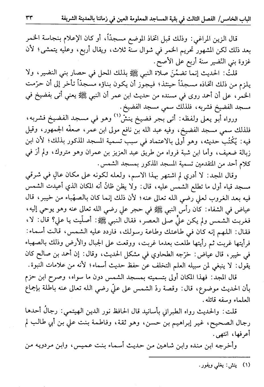 قال المجد: فهذا المكان أولى بتسميته بمسجد الشمس دون ما سواه، وصرح ابن حزم بأن الحديث موضوع، قال: وقصة ردّ الشمس على عليّ رضي الله تعالى عنه باطلة بإجماع العلماء وسفه قائله.
