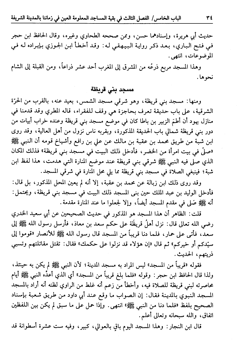 قلت: الظاهر أن هذا المسجد هو المذكور في حديث الصحيحين عن أبي سعيد الخدري رضي الله تعالى قال: نزل أهل قريظة على حكم سعد بن معاذ، فأرسل رسول الله صلى الله عليه وسلم إلى سعد، فأتى على حمار، فلما دنا قريبا من المسجد قال رسول الله صلى الله عليه وسلم للأنصار «قوموا إلى سيّدكم أو خيركم» ثم قال «إن هؤلاء قد نزلوا على حكمك» فقال: تقتل مقاتلتهم وتسبي ذريتهم، الحديث.